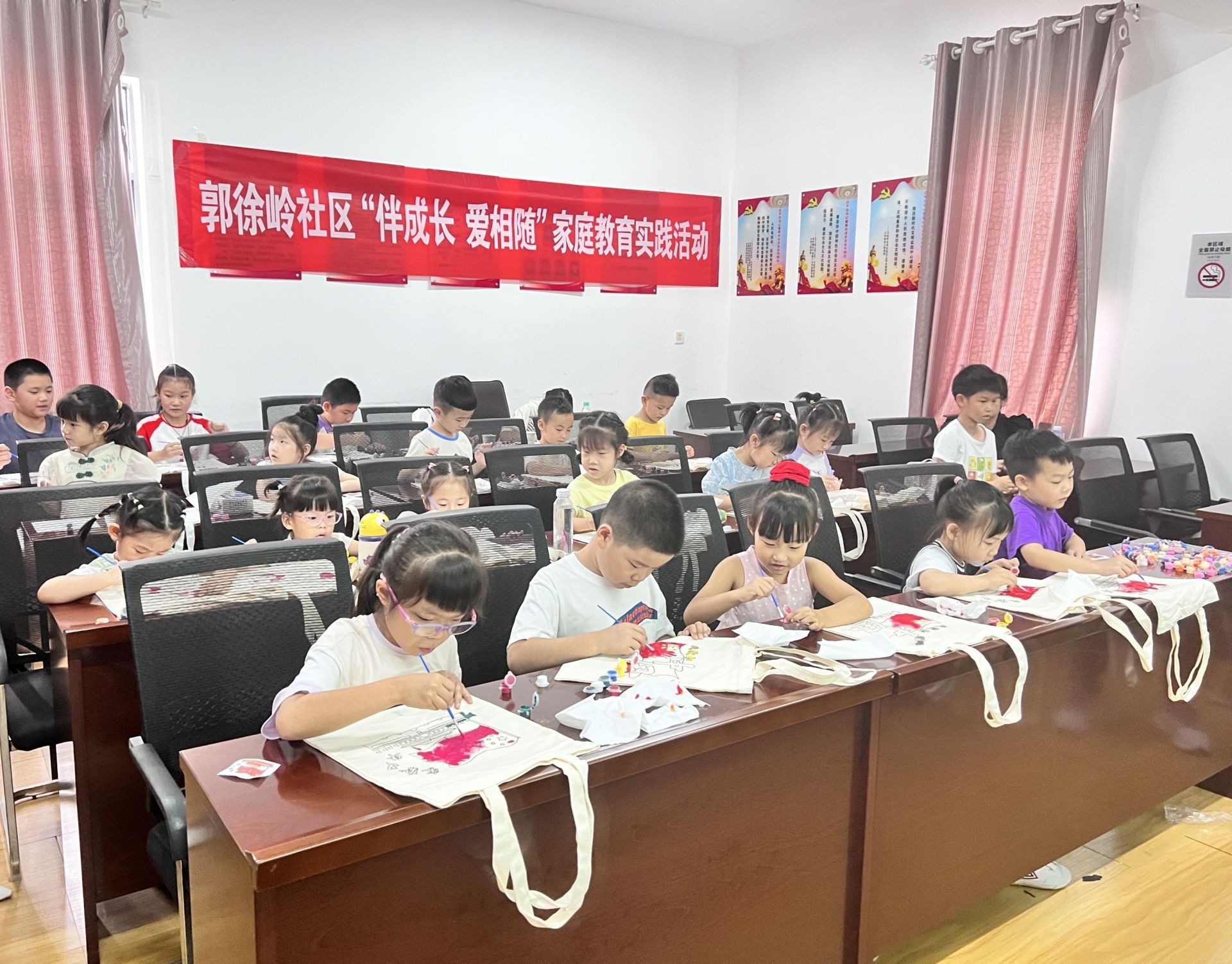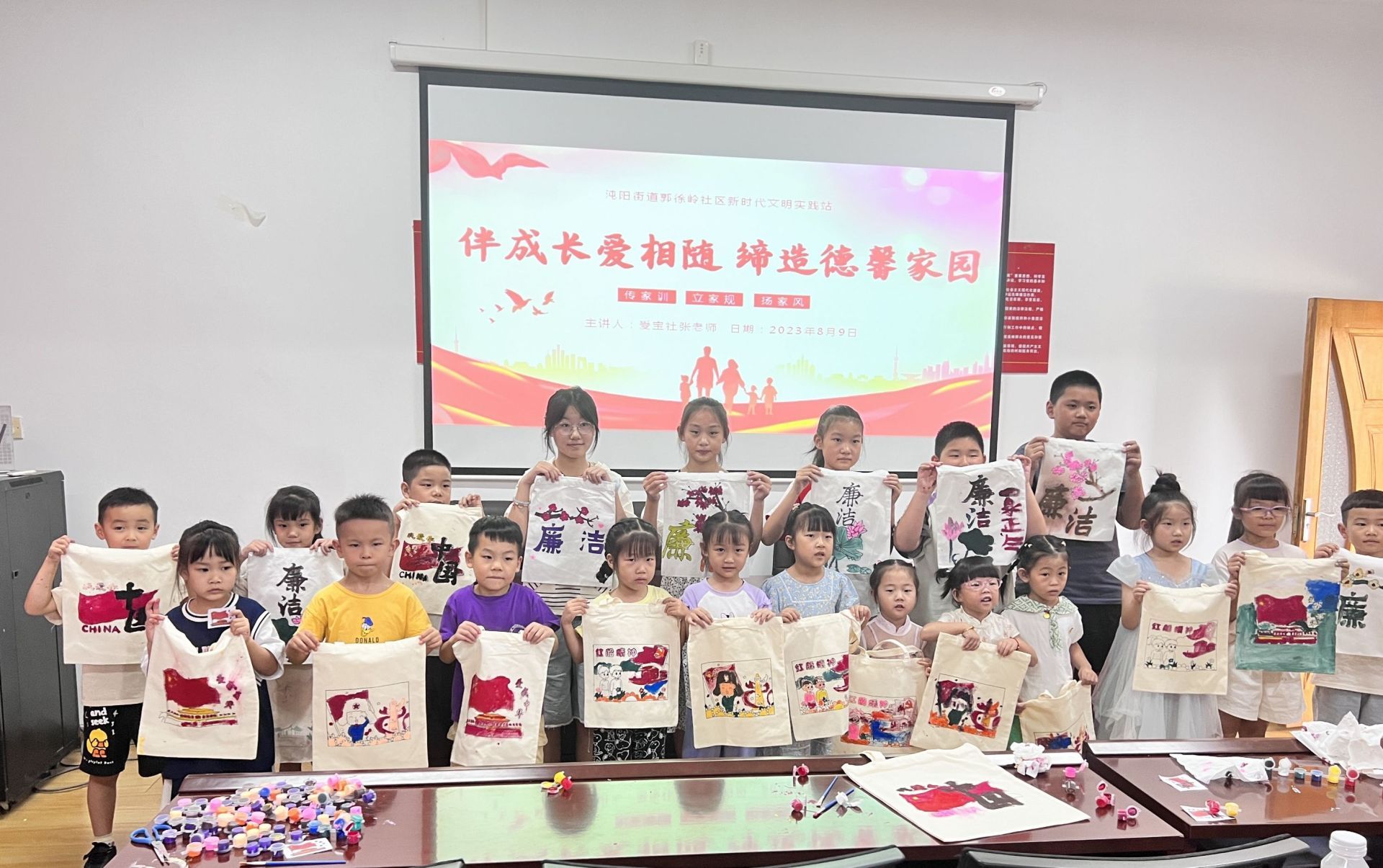 现场,志愿者还指导孩子们以“荷叶、荷花、清廉、廉洁”等图案字样制作清廉文化帆布袋,孩子们迅速动手画起来,一笔一画,非常投入。很快,一个个漂亮的、五颜六色的“清廉手提袋”就制作完成。