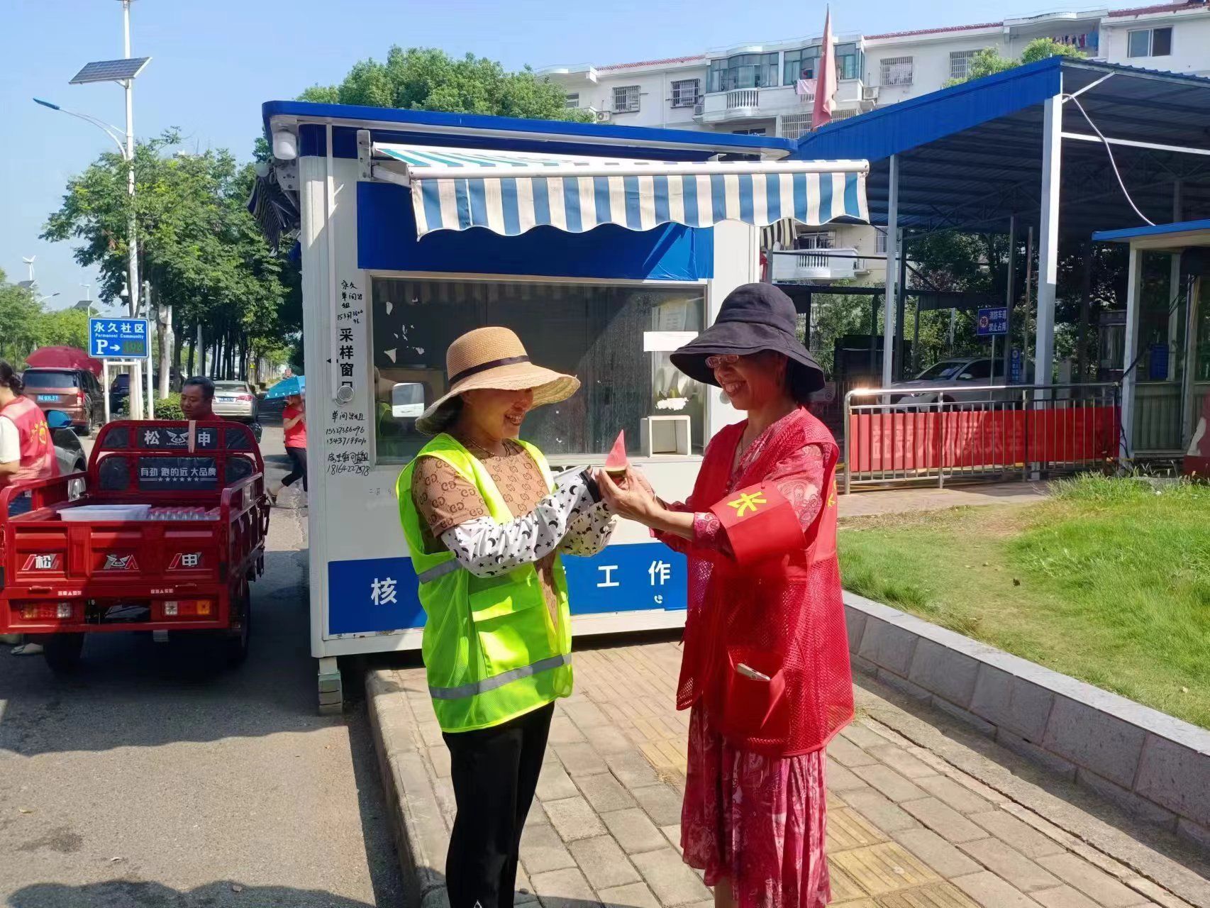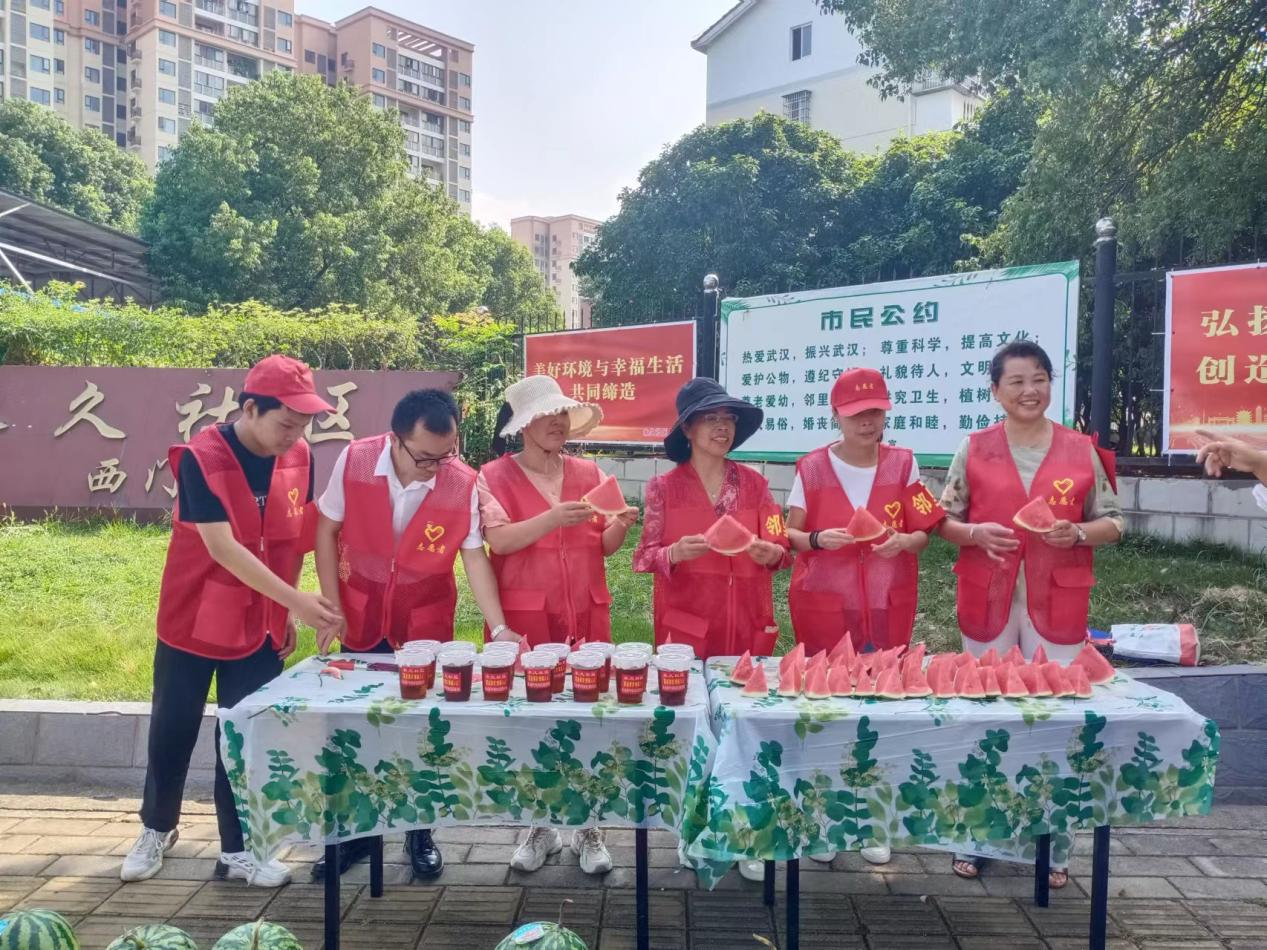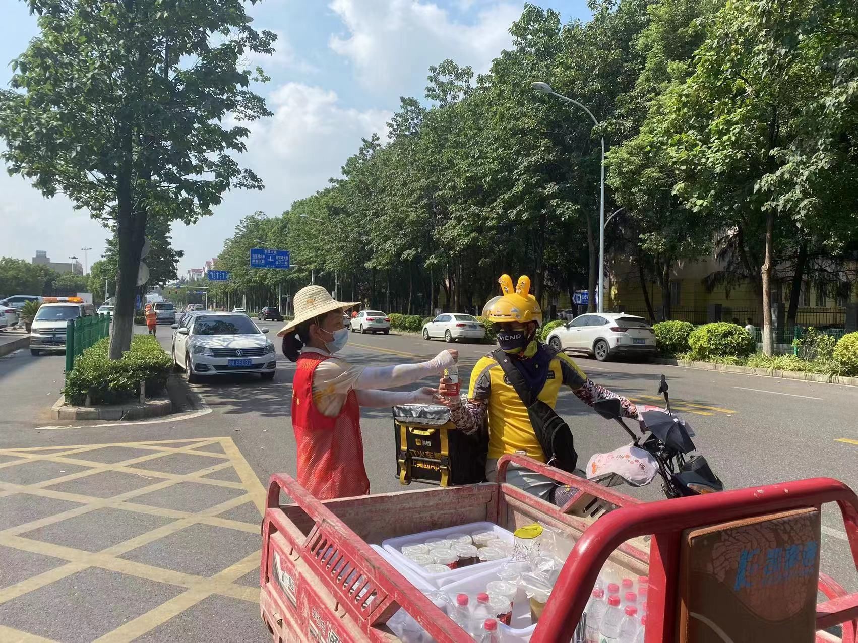 活动中,永久社区工作者与社区志愿者“邻里长”将冰镇酸梅汤、绿豆汤、西瓜送到户外工作者手中,再三叮嘱环卫工人夏季高温天气要时刻注意身体状况,做好防暑降温工作。