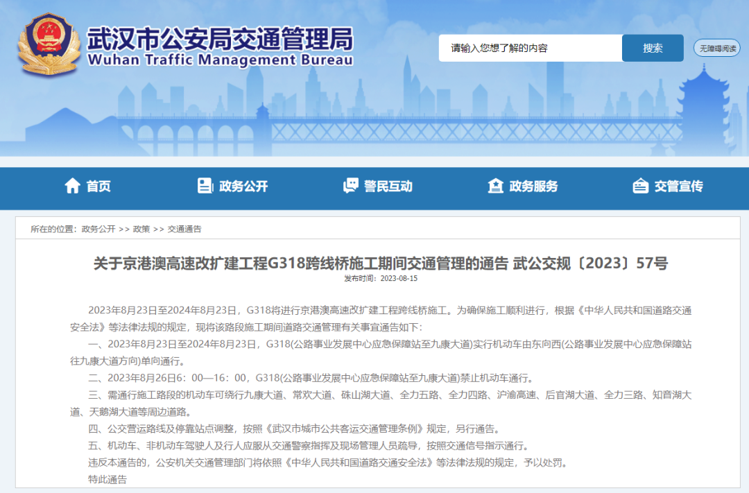 2023年8月23日至2024年8月23日,G318将进行京港澳高速改扩建工程跨线桥施工。为确保施工顺利进行,根据《中华人民共和国道路交通安全法》等法律法规的规定,现将该路段施工期间道路交通管理有关事宜通告如下: