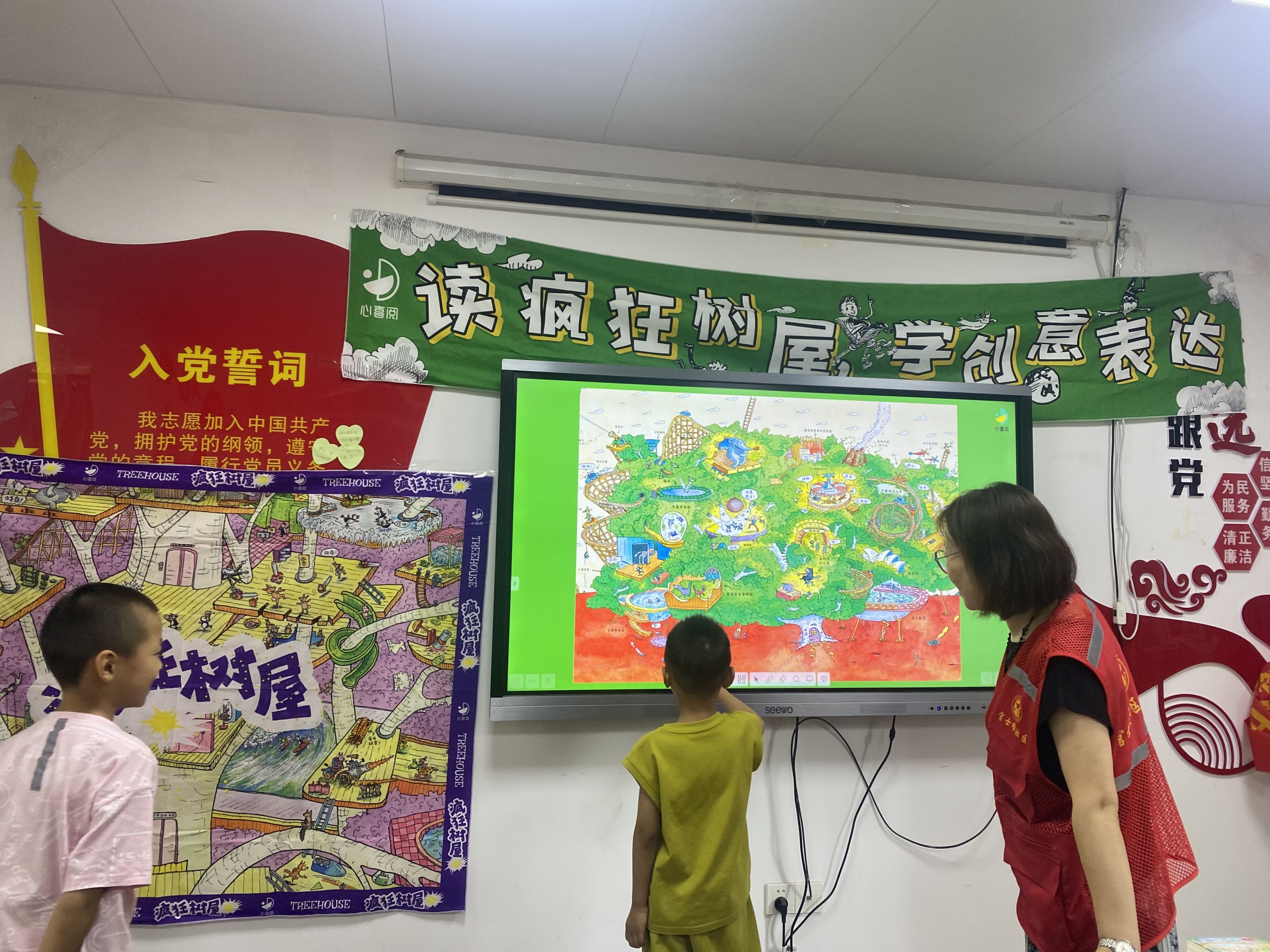 活动现场,老师先带领小朋友们进行了热身游戏——松鼠与树屋,随后和小朋友共读儿童文学《疯狂树屋》。“树屋里面有什么?”“我希望树屋里面有吃不完的冰淇淋和棉花糖!”“树屋里面有哆啦A梦和时光机!”小朋友们畅所欲言描述着脑海中浮现出的奇幻场景。