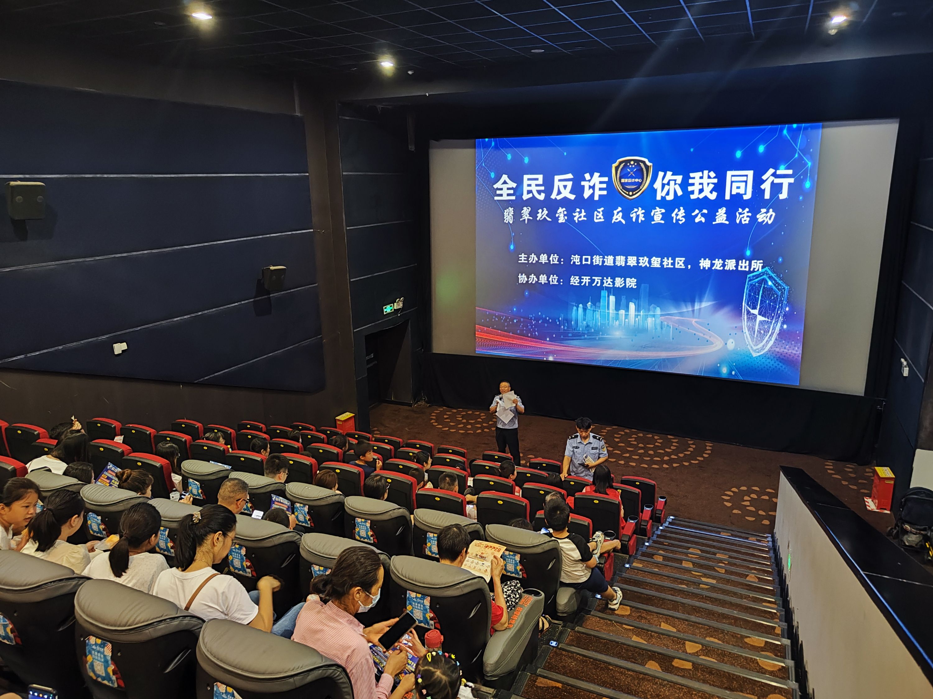 车谷融媒8月22日讯 8月22日,沌口街道翡翠玖玺社区联合神龙派出所、经开万达影城开展“全民反诈”公益观影活动,组织辖区居民集中观看反诈电影《孤注一掷》。