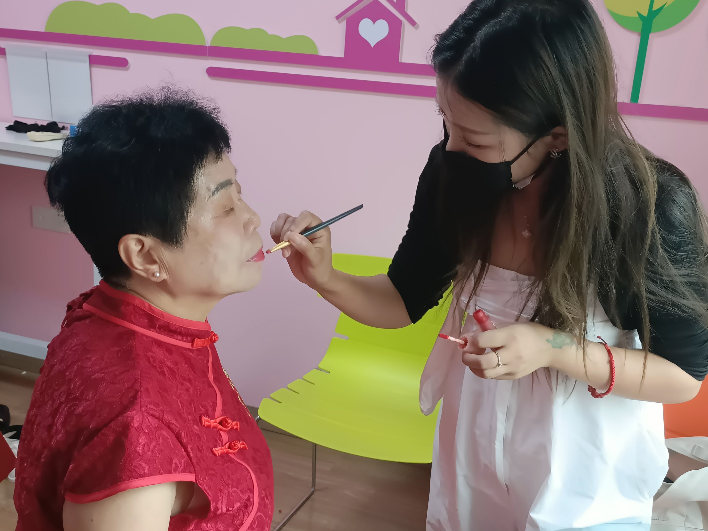 活动当天,老人们早早来到社区活动室,在专业化妆师的帮助下化好美美的妆容。喜庆的秀禾、优美的旗袍、笔挺的西装,老人们个个神采奕奕、容光焕发。