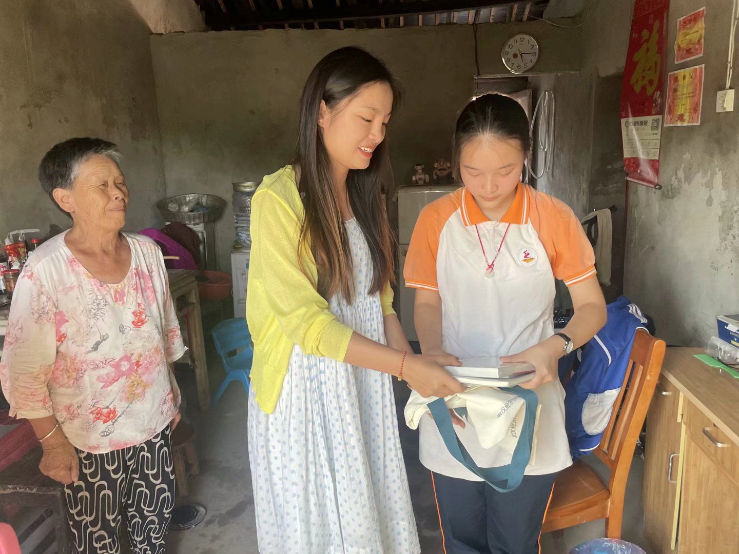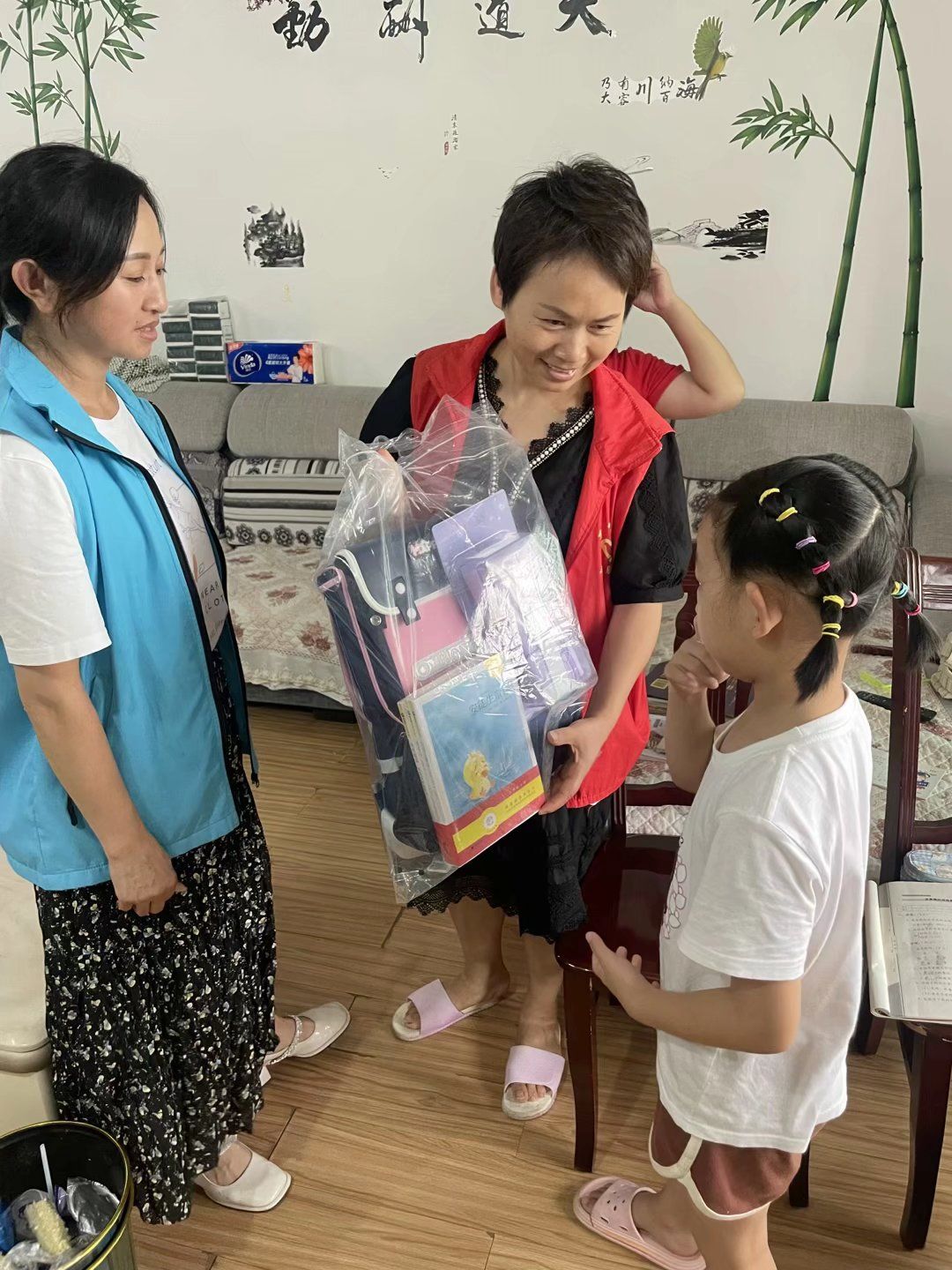“欣怡,你想要的九年级的课外书和新书包,看看,喜欢吗?”看到工作人员上门慰问,欣怡赶忙上前迎接。