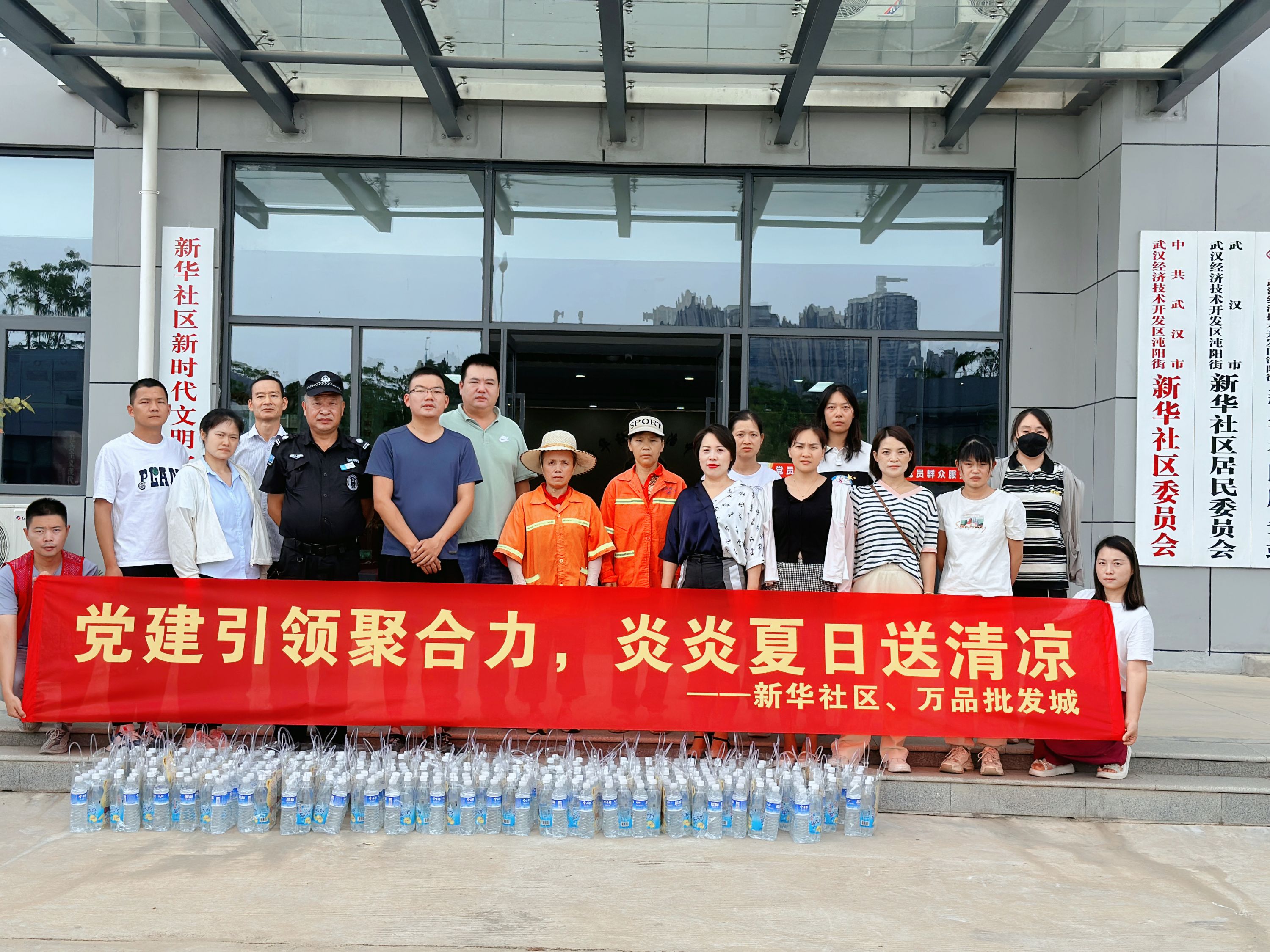 处暑已至,武汉夏天仍然高温难耐。新华社区工作人员以及商户万品批发城共同行动,为小区内的一线保安、保洁人员送上了矿泉水、盐汽水等清凉大礼包。