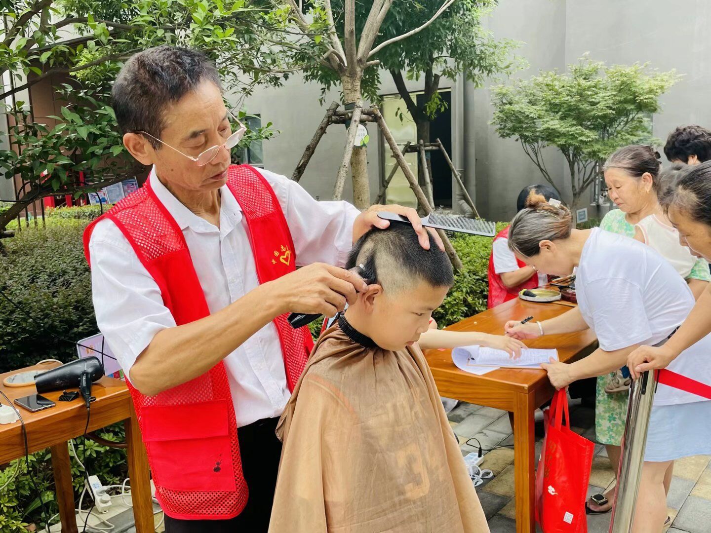 在理发摊位前,居民们有序排队,志愿者一手拿梳子、一手拿剪刀,动作十分熟练。
