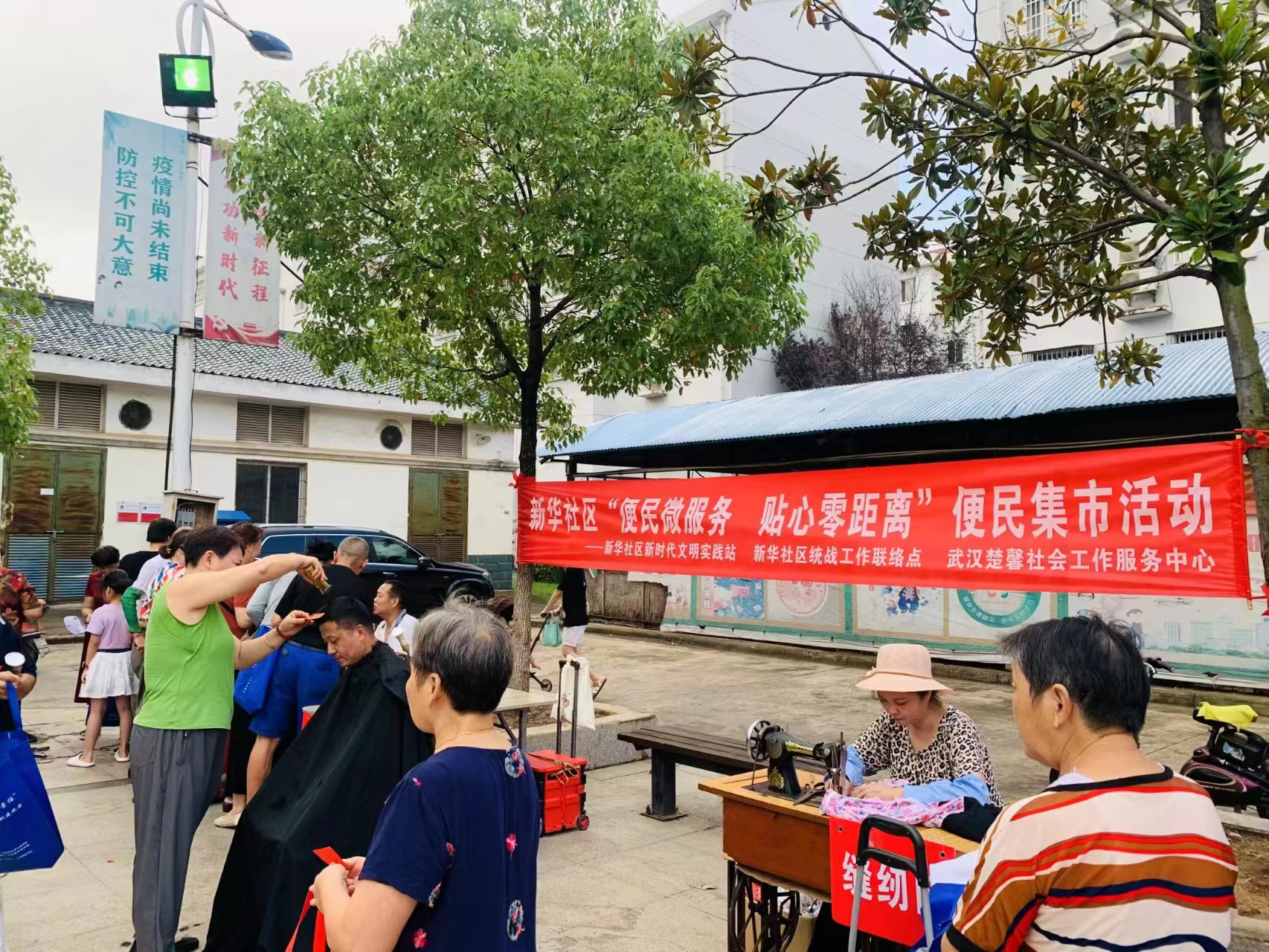 在中环湖畔小区中心广场,“便民微服务,贴心零距离”便民集市活动共设理发、磨刀、修鞋、配钥匙及缝纫等6个摊位,居民们有序地排队参与。