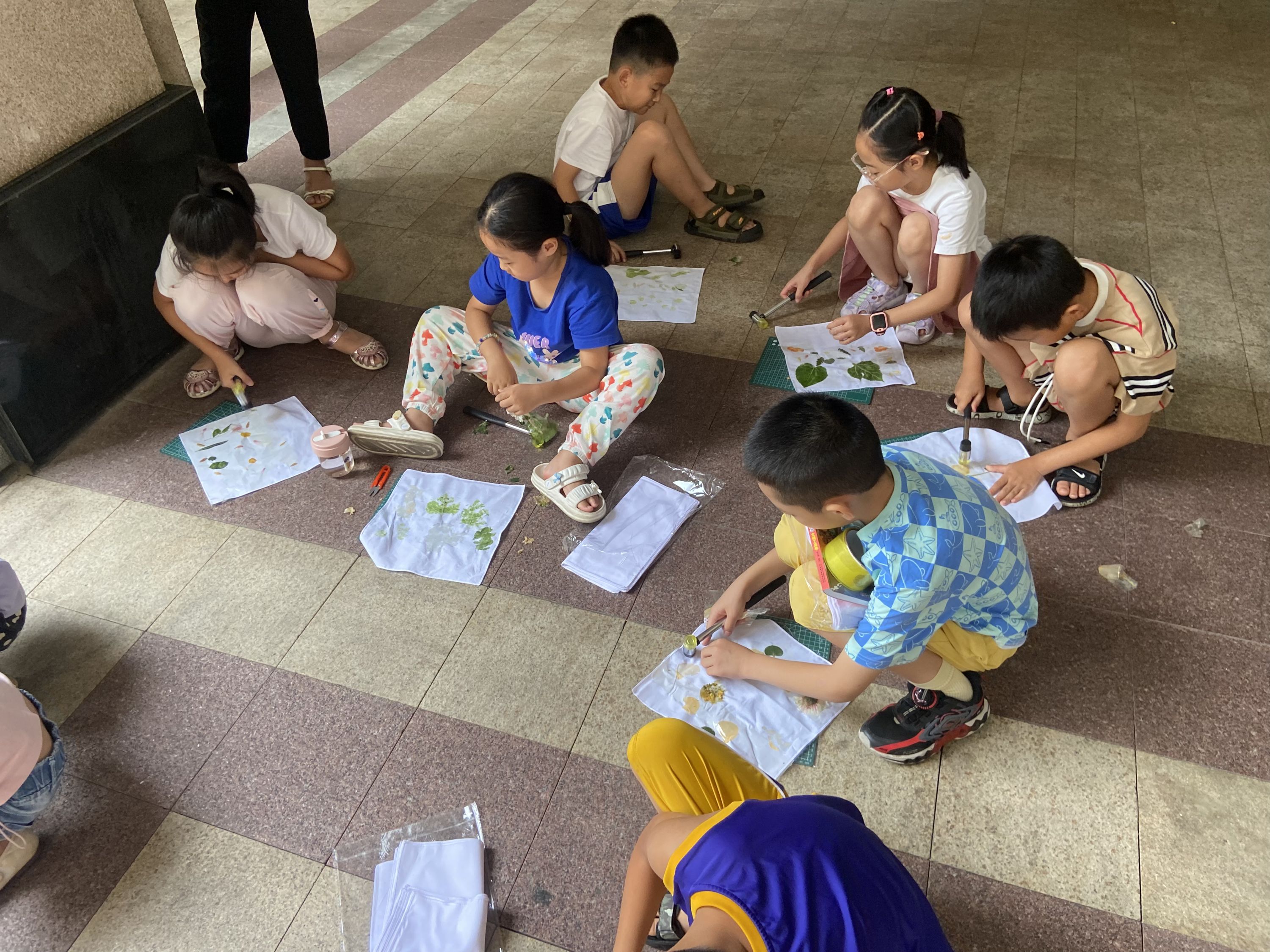 孩子们在社工的指导下,把浸泡过的植物用纸巾擦拭干净,精心地排列布局,将自己拼合的图案固定,然后使用橡胶锤一点一点地锤、压,释放出植物自有的颜色,伴随着细碎的敲击声和花草香,不多时,一幅幅色彩斑斓、别具一格的天然画卷就制作完成了。