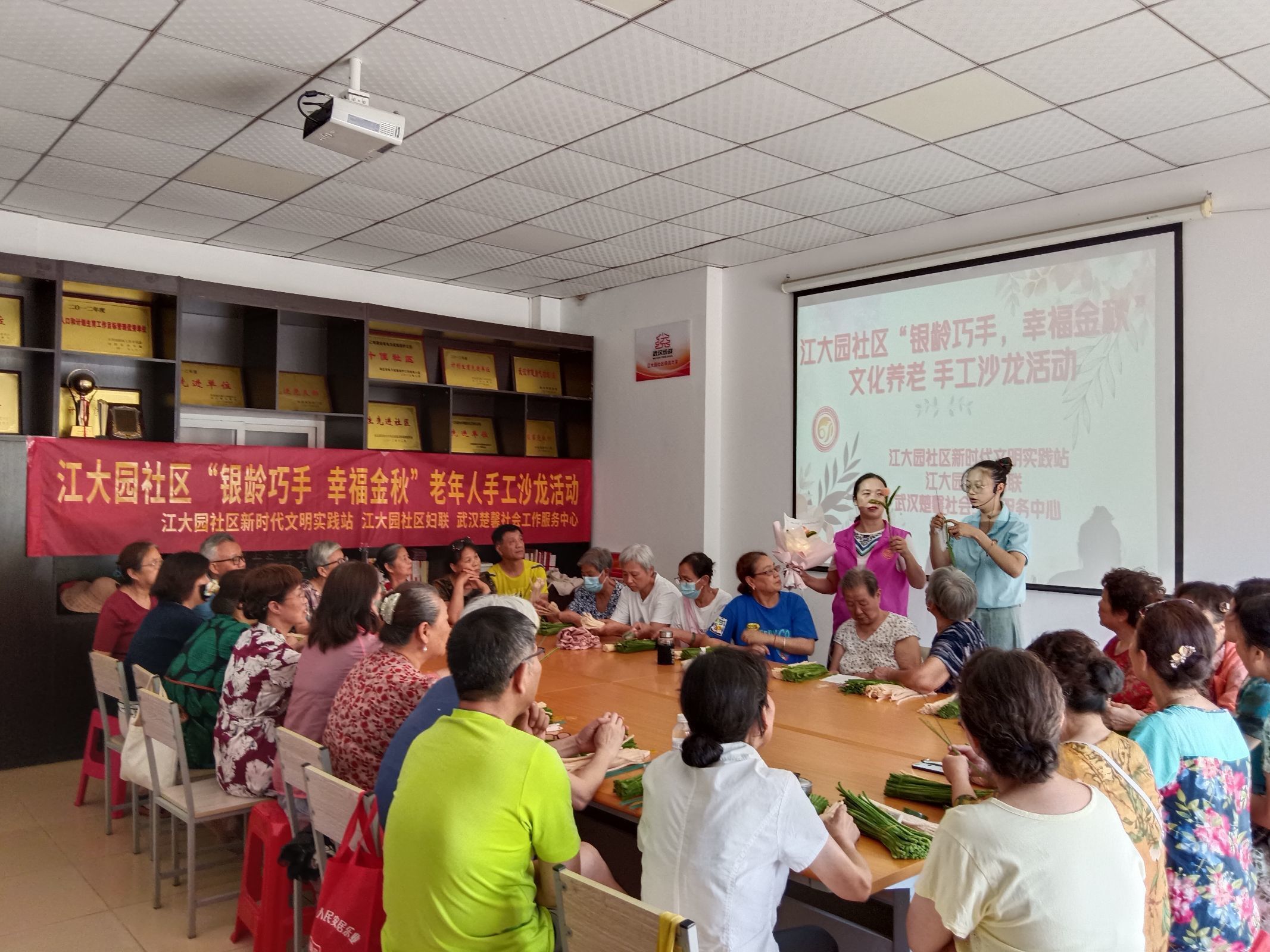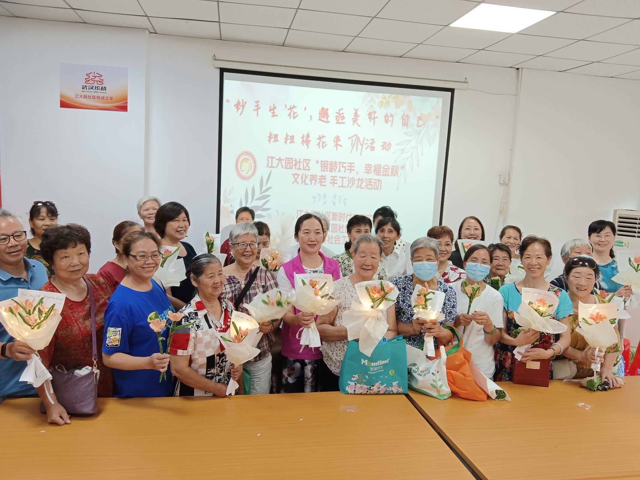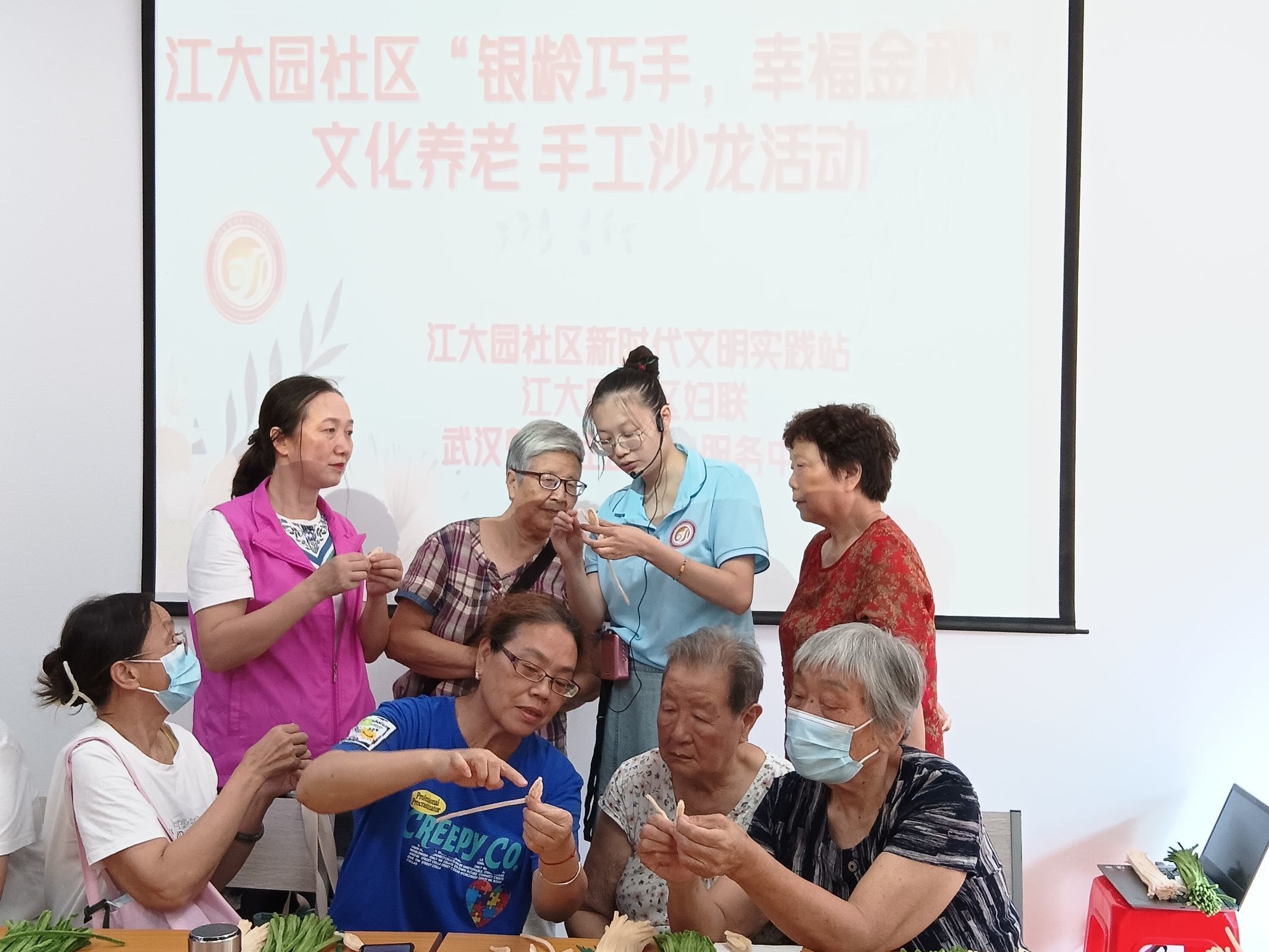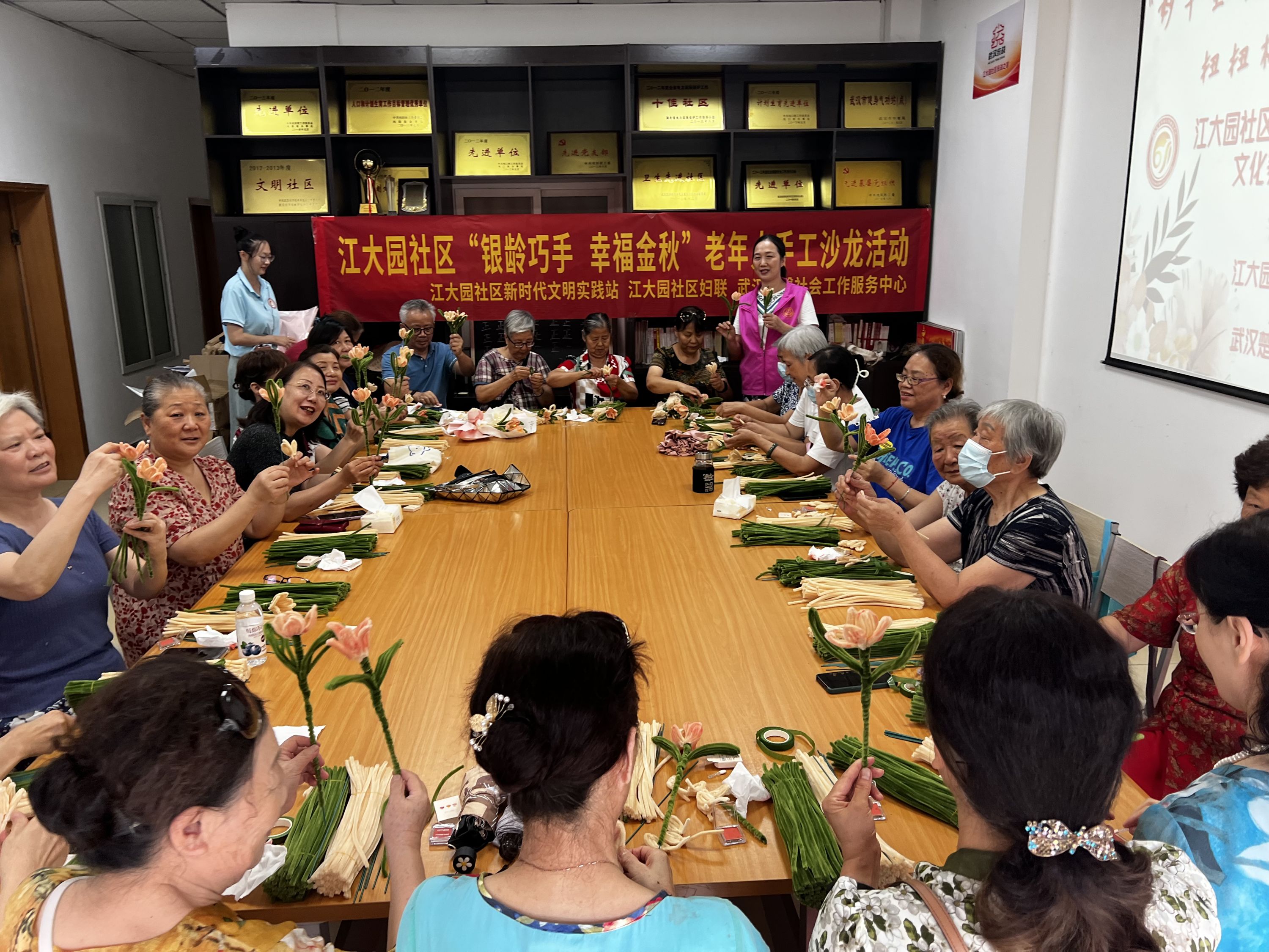 9月10日,沌阳街道江大园社区新时代文明实践站联合武汉楚馨社会工作服务中心开展“银龄巧手,幸福金秋”老年人手工沙龙活动,带领老年人用扭扭棒制作永生花,并包装成花束送给自己,丰富辖区老年人精神文化生活,促进居民间的沟通交流。