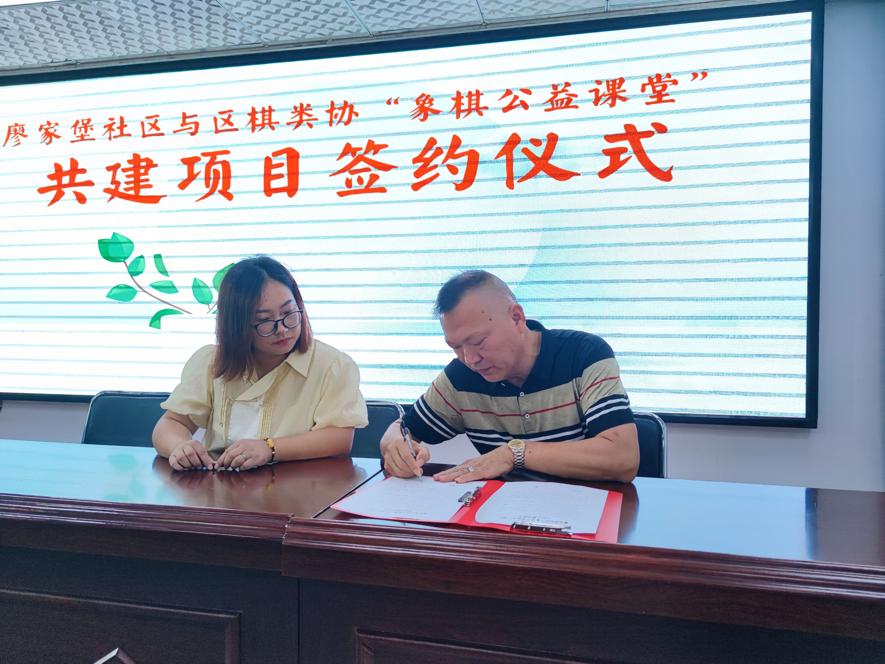当天,廖家堡社区与武汉经开区棋类协会签订了“象棋公益课堂”合作共建项目,开展公益培训,为社区青少年儿童提供象棋教学志愿服务,助力象棋文化传承推广。