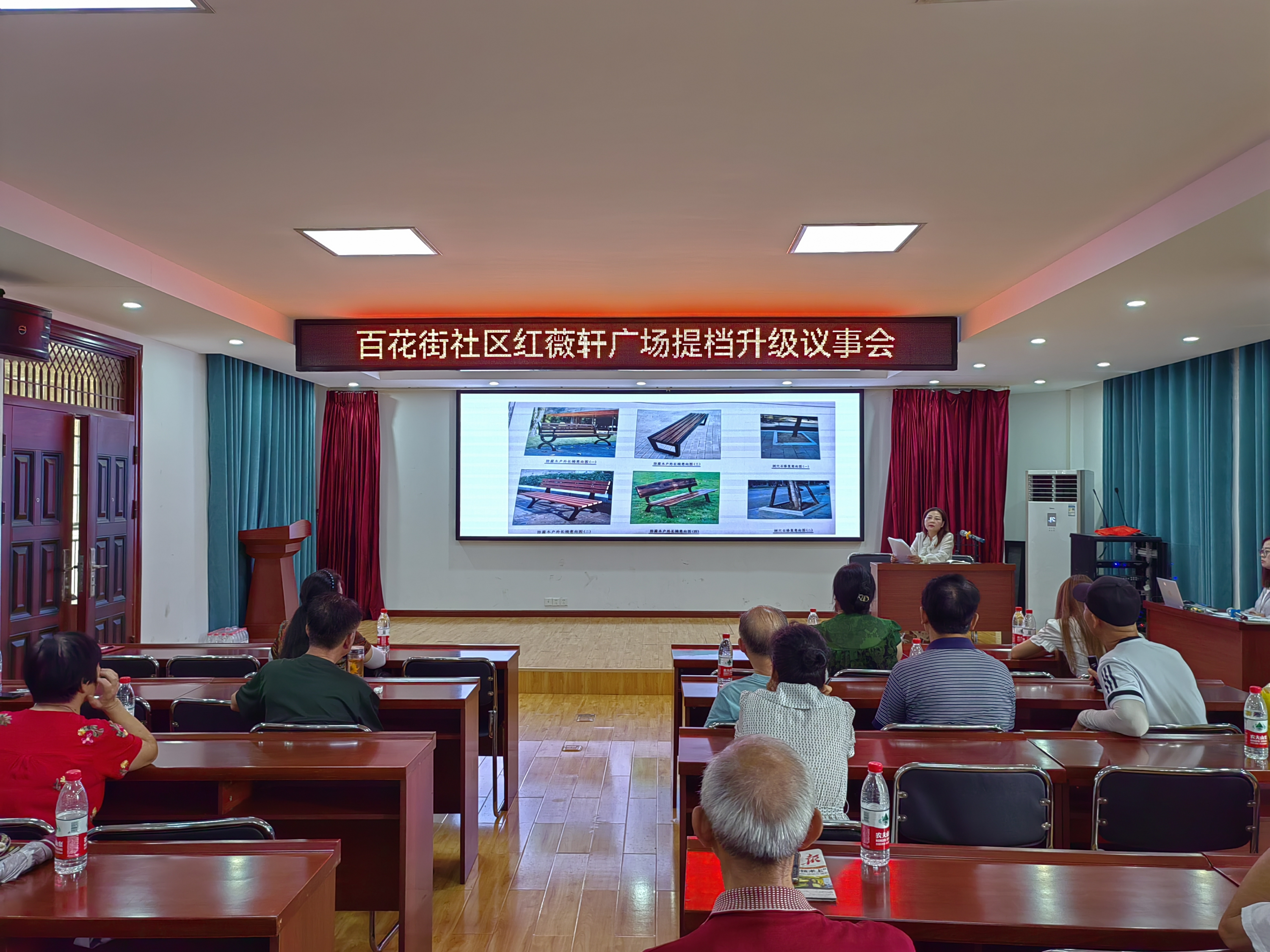 红薇轩小区广场提档升级改造前,百花街社区搭建居民议事平台,以逐家逐户上门、发放征求意见表、召开商讨会等方式征求居民意见,不断优化设计方案,让广大居民充分参与到“改什么、怎么改、怎么管”的小区广场改造全过程。