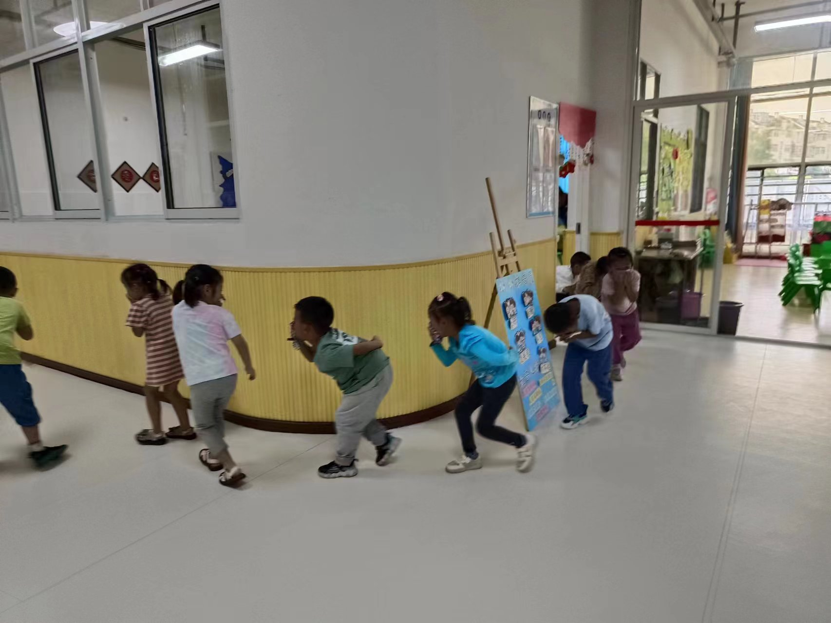 随着警报声响起,幼儿园的小朋友在老师的组织下迅速排队,用湿毛巾捂住口鼻,弯着腰小步快走,有序排队下楼,在规定时间内撤离到户外操场。