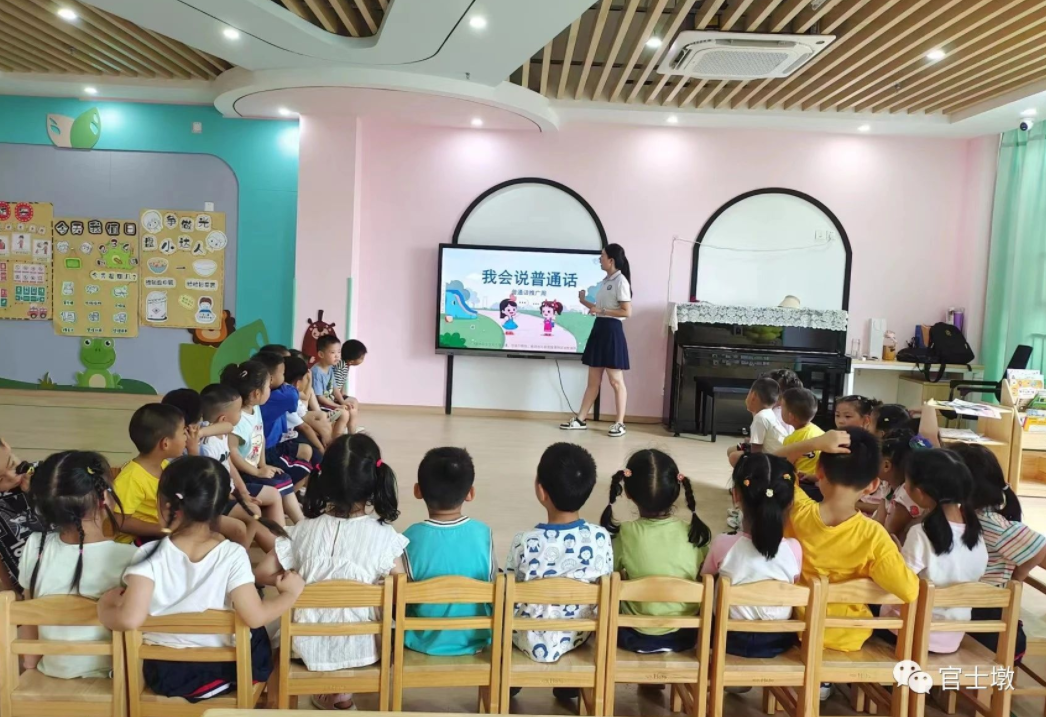 官士墩幼儿园通过国旗下讲话,推广普通话,打造文明校园;发出倡议书,共创良好环境;开展各班级主题教育,在学习普通话的活动中激发了幼儿爱说、说好普通话的热情;以亲子共读为纽带,营造浓郁学习氛围。