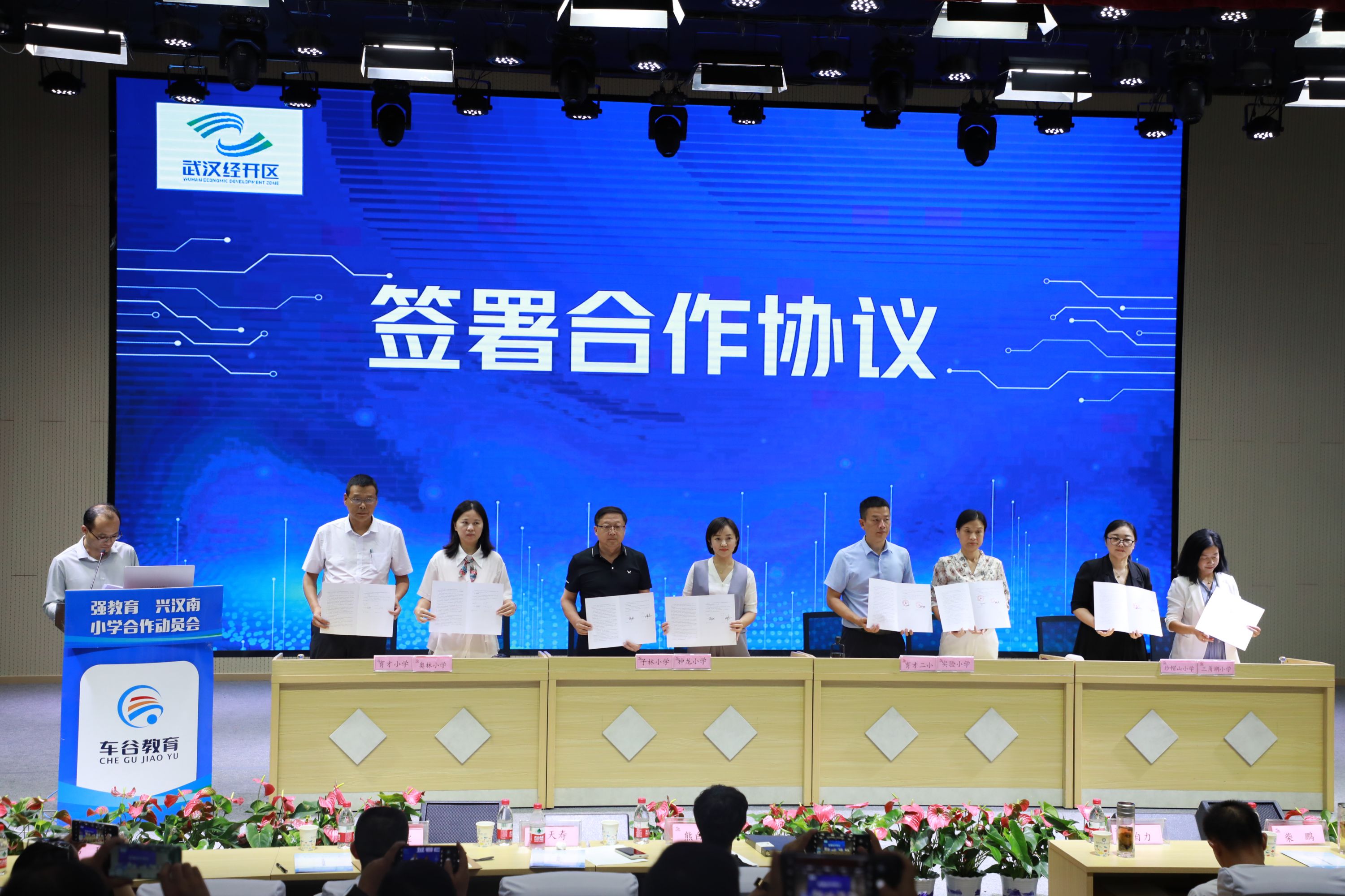 会上,神龙小学与子林小学、实验小学与育才二小、三角湖小学与纱帽山小学、奥林小学与育才小学分别签署了《武汉经开区小学合作协议书》。
