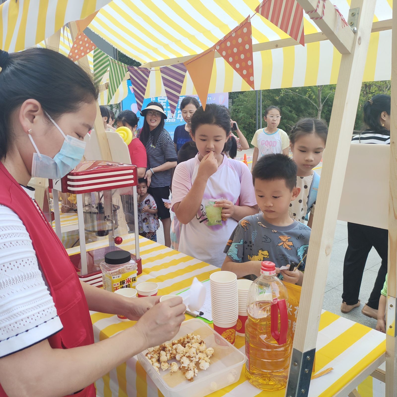 赛场另一边“萝卜蹲大赛”“障碍跑”比赛项目也正紧张、激烈地进行着,等候区的小朋友们更是一个个摩拳擦掌、跃跃欲试……还有的小朋友更是不断在“趣味畅玩区”和“萌娃PK赛区”来回穿梭,“趣味畅玩区”的爆米花、棉花糖更是成为观赛区不少“吃瓜”小观众的“热门”零食榜首,萌哒哒的小丑气球、DIY手工自制灯笼、泡泡秀等摊位前更是络绎不绝、热闹非凡,活动现场呐喊声、欢笑声、喝彩声连成一片,每个人脸上洋溢快乐的笑容。