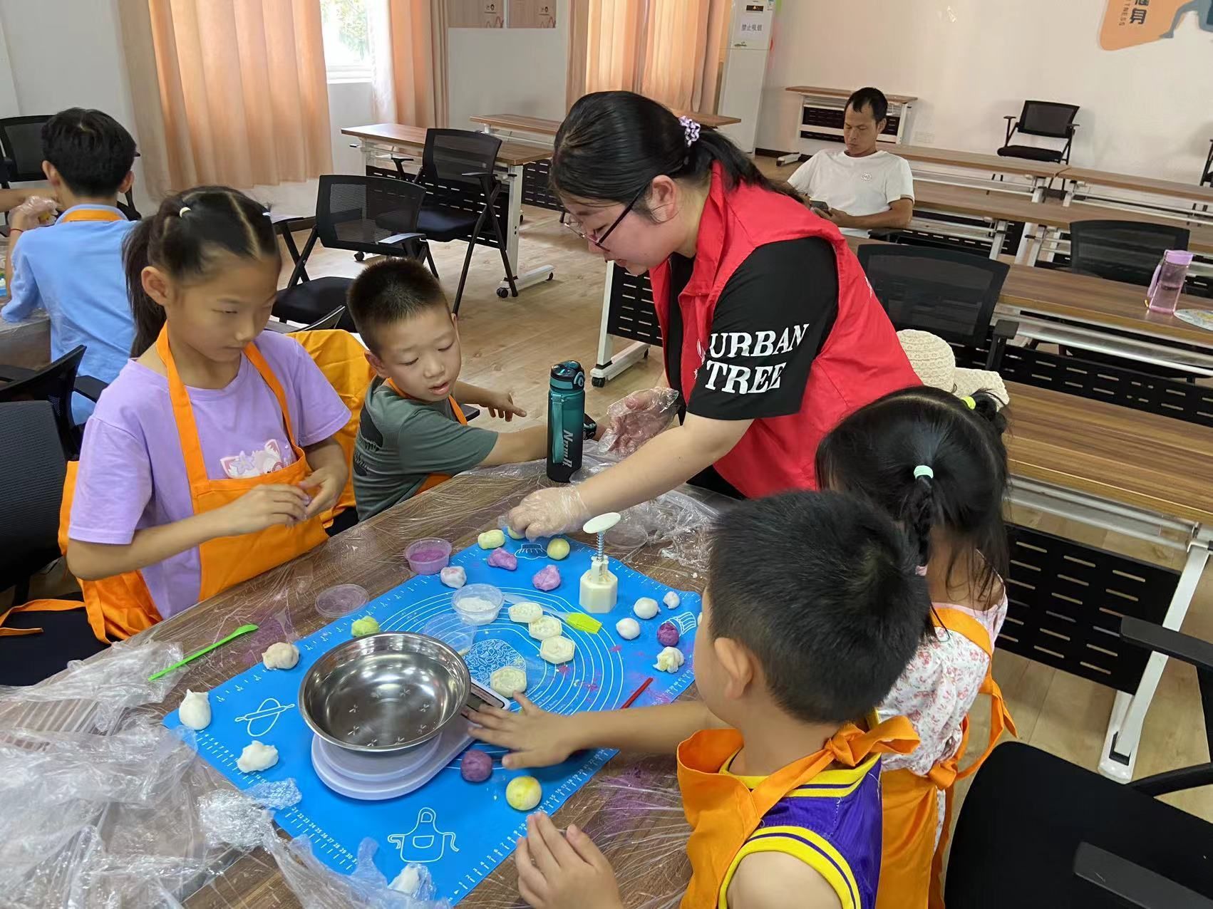 活动现场,社工结合PPT为大家讲解中秋节的历史人文故事,讲述月饼的由来,激发起大家参与做月饼的兴趣。随后,社工为大家分发制作月饼的原料,制作月饼看似简单,实则需要一定的耐心。大家选好自己喜欢的馅料后开始揉面皮,有的小朋友面皮水加少了,面皮太黏,有的小朋友水加多了,面皮又不成型……在老师和社工的帮助下,大家都完成了面皮的制作。
