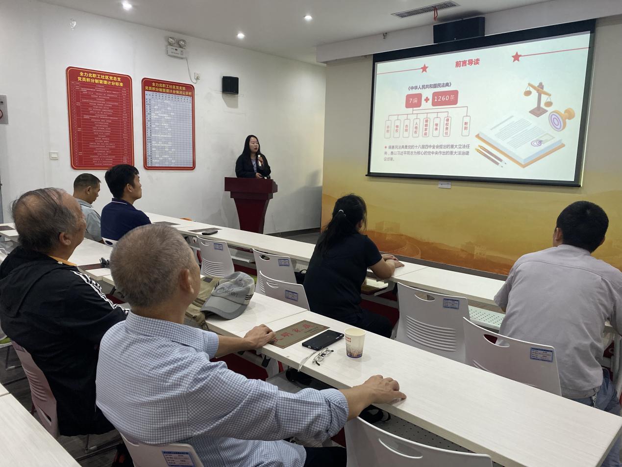 活动现场,讲师联系当下热点,以“法条+案例”形式,选取了发生在群众身边的案件,深入浅出地讲解了法治相关的知识,为居民科普了自身的权利和义务,鼓励居民争当社区“主人翁”,积极参与社区共同缔造。社工和社区工作人员为参会居民发放了《民法典》宣传册。居民们纷纷表示通过本次讲座学习到了很多实用的法律知识,希望社区以后能够多多开设类似的法治知识宣传活动。