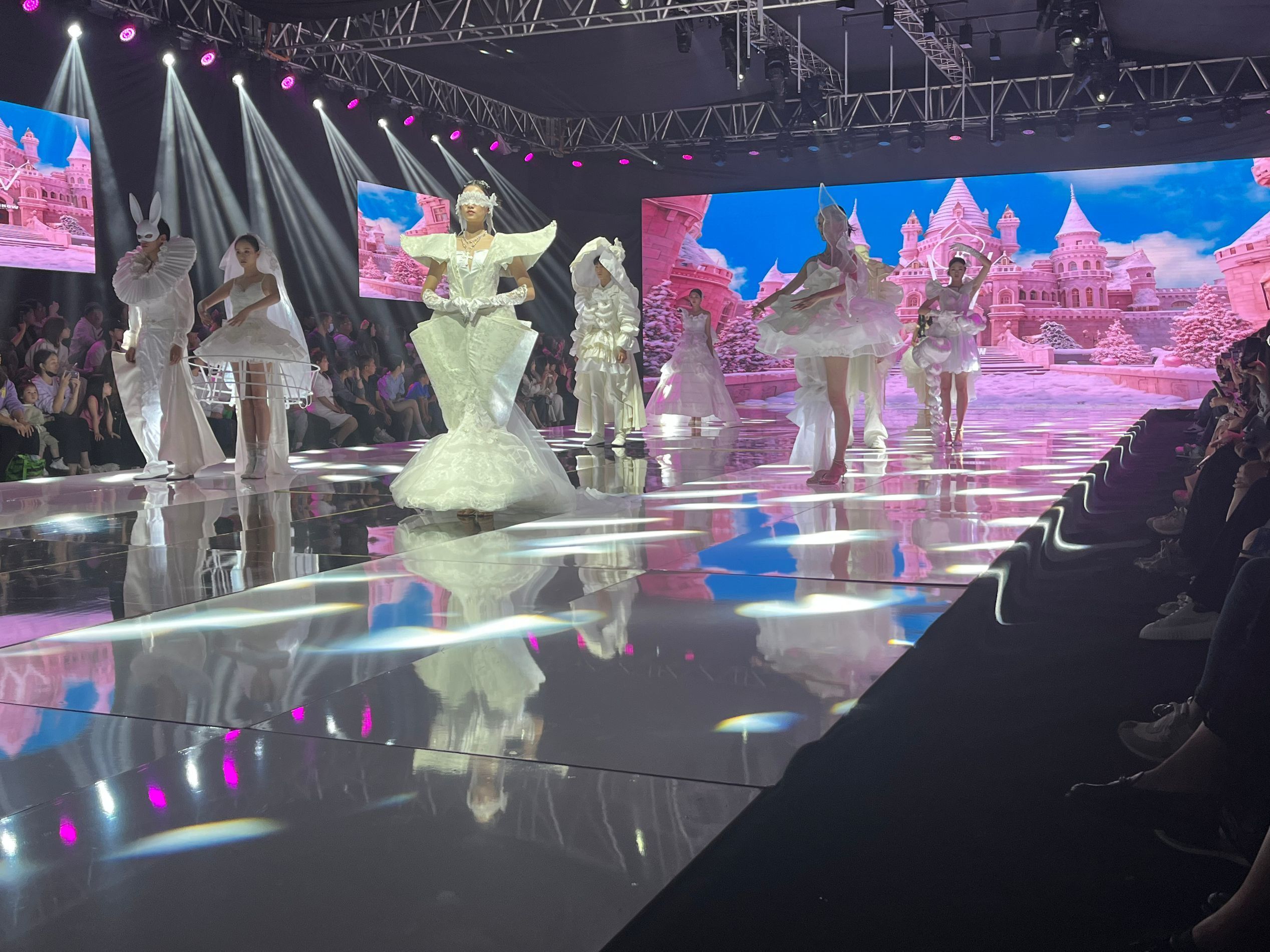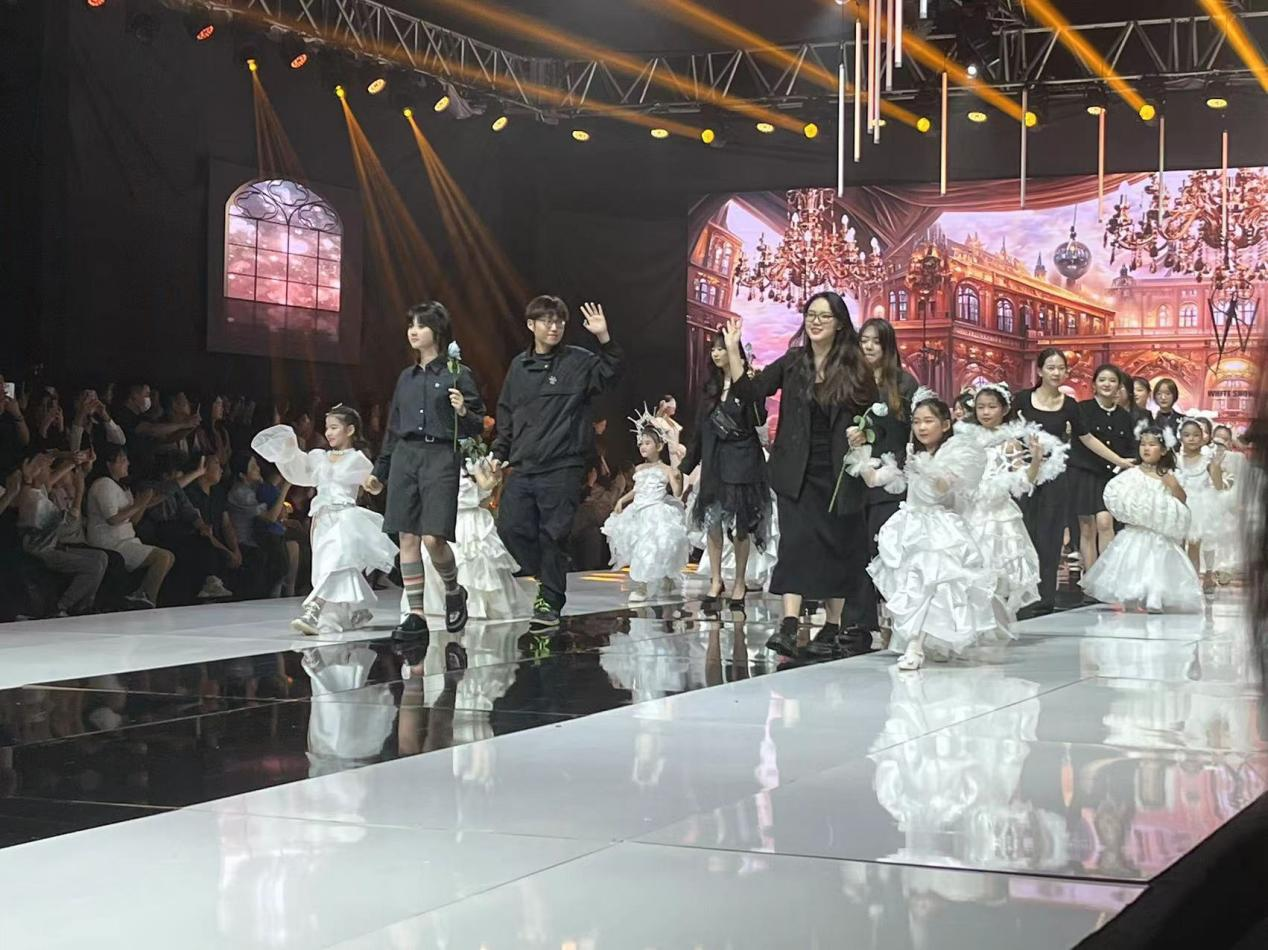 随着激昂劲爆的开场音乐灯光秀,秀场美育课堂正式开始。在八音盒悦耳动听的音乐中,现场舞者翩翩起舞,手势触摸灯光点亮舞台上一个个身穿极具设计感的服装模特,紧接着时尚动感的音乐,身穿银隅的专业模特吸引着现场观众的目光,不停变换的灯光幕布、抑扬顿挫的音乐走秀,耳目一新的服装设计……大家沉浸在视觉、听觉完美融合为一体的美育盛宴中。