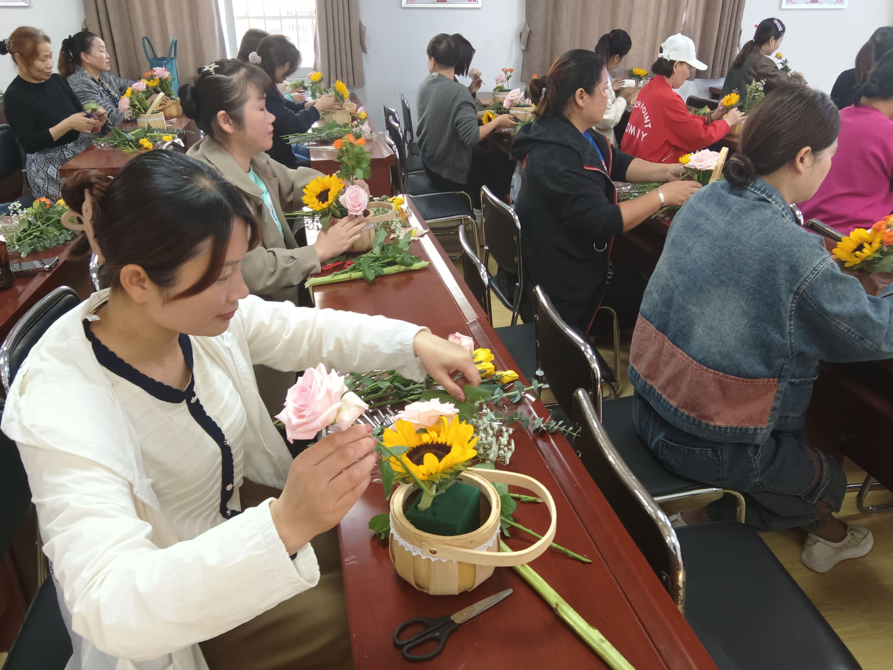 培训课上,插花老师从鲜花养护常识、插花艺术两个方面,为大家讲解插花基本要领和细节处理,并现场带领大家制作插花作品。剪枝、设计摆放、修剪、装饰……在老师的指导下,一盆盆独具匠心的插花作品就诞生了,生动美丽。老师还为大家介绍了插花技能的就业途径,便于大家就业创业。“我是第一次接触插花,很感兴趣,考虑继续深入学习,多学点技能就有信心去再就业了!”学员陈女士说道。