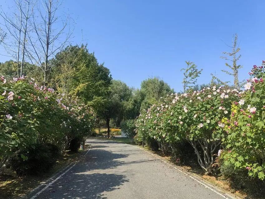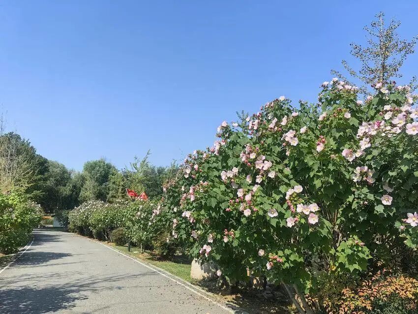 木芙蓉为汤湖公园的园花,园内栽植有白芙蓉、红芙蓉、鸳鸯芙蓉、三醉芙蓉、七星芙蓉等16个品种的木芙蓉1500余株。从花型上来区分品种,有单瓣芙蓉和重瓣芙蓉之分。单瓣芙蓉每年6月中旬到7月中旬,有近一个月的初花期,进入7月中旬到9月中旬,由于高温强阳,花期回缩,到了9月中旬白露过后,秋分时节,单瓣木芙蓉又逐渐开花,国庆假期寒露过后,逐渐进入盛花期,单瓣芙蓉花期持续到10月底。重瓣芙蓉从10月下旬霜降时节开花,花期持续到11月中旬。