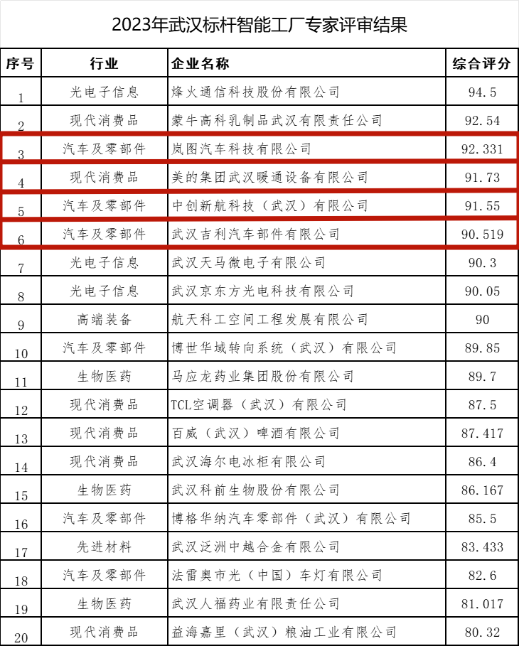 车谷融媒10月31日讯 日前,武汉市经济和信息化局公示“2023年武汉标杆智能工厂”专家评审结果,全市共10家企业上榜,岚图汽车、武汉美的暖通工厂、中创新航和武汉路特斯汽车工厂4家武汉经开区企业位列其中,入围数量全市第一。