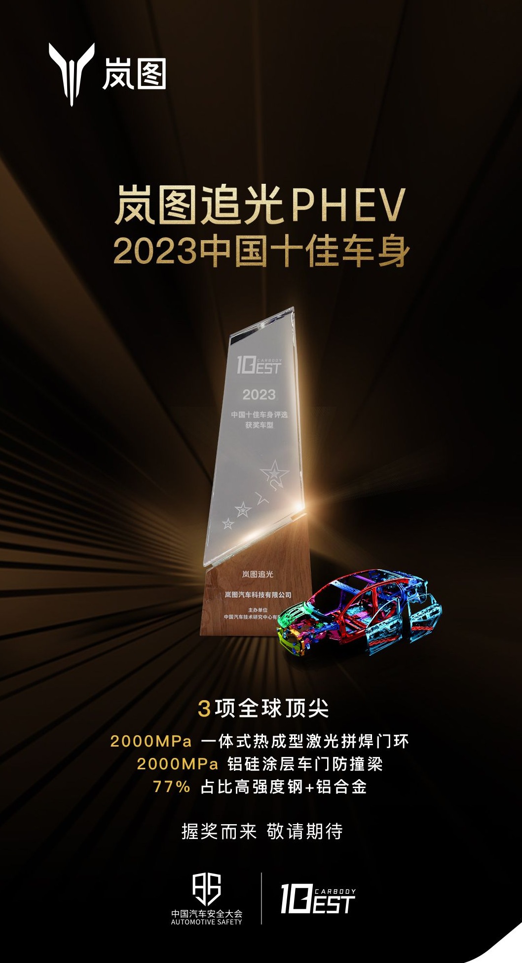 10月31日,中国汽车技术研究中心揭晓了“2023年度中国十佳车身”大奖,岚图追光PHEV白车身凭借2项全球首创和3项全球领先的车身技术、全面且优异的车身综合性能,斩获“中国十佳车身”大奖,彰显了岚图追光PHEV在车身开发、整车安全、制造工艺等领域拥有的领先技术实力。