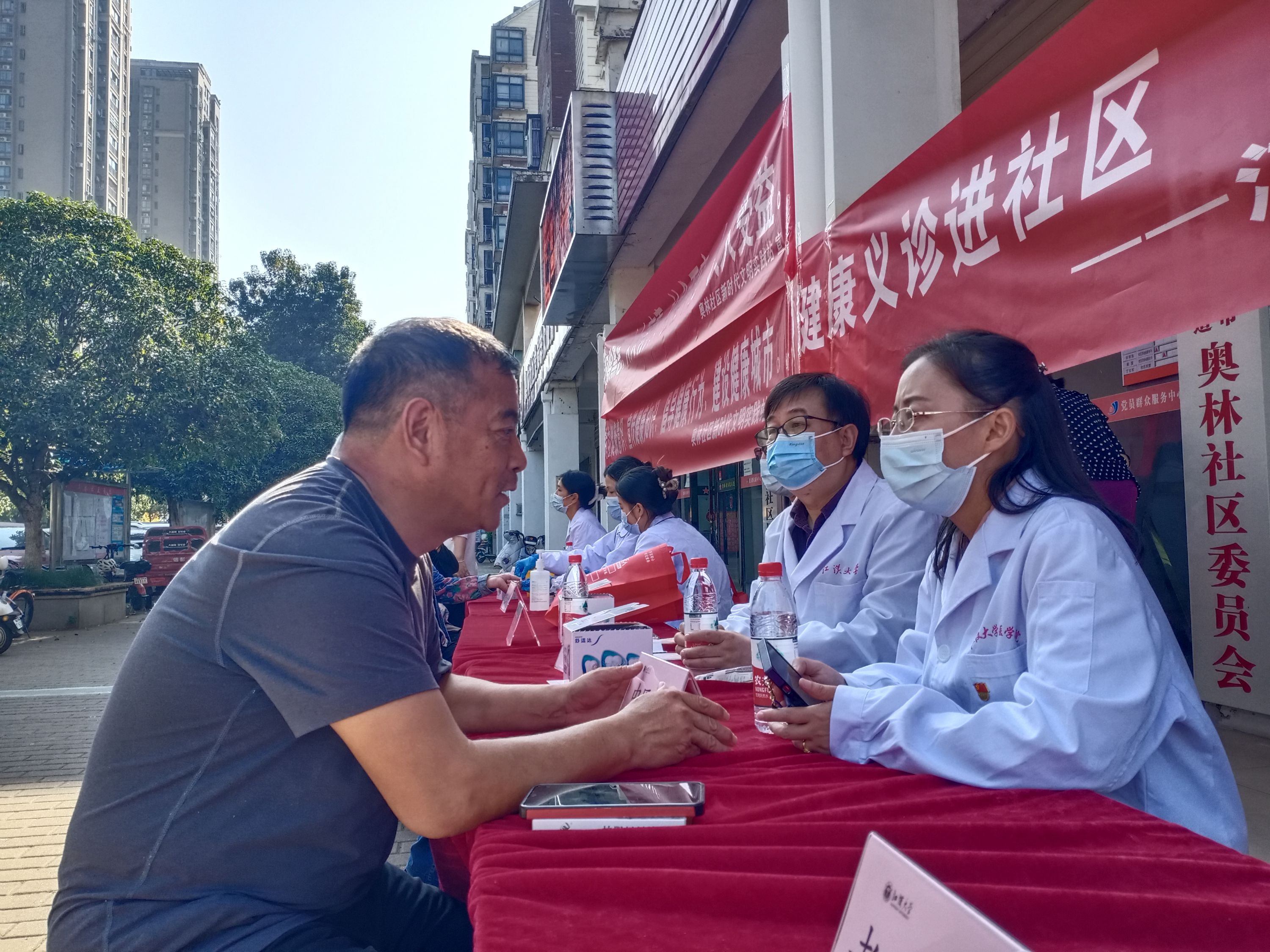 “爹爹,您的降压药还是要每天吃,不能因为血压降了一点就自己把药停了!”活动现场,来自江汉大学医学部外科、消化内科、口腔保健、妇科、全科、老年护理等科室的老师们,结合各自的专业特长,为每一位前来就诊的居民提供测量血压、血糖、心肺听诊、用药咨询、中医推拿等服务,针对居民的潜在病情,进行个性化的康复、用药及健康指导,同时倡导居民养成合理饮食、规律作息、适当运动、乐观生活的好习惯。