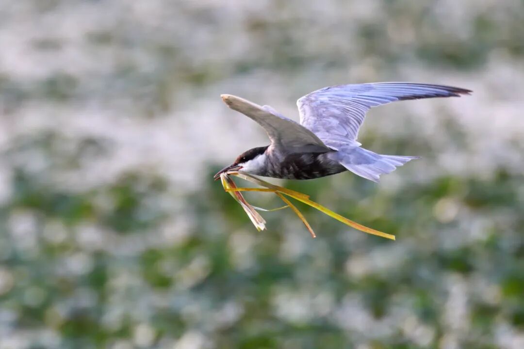 ▲万家湖公园衔来水草准备筑巢的灰翅浮鸥。