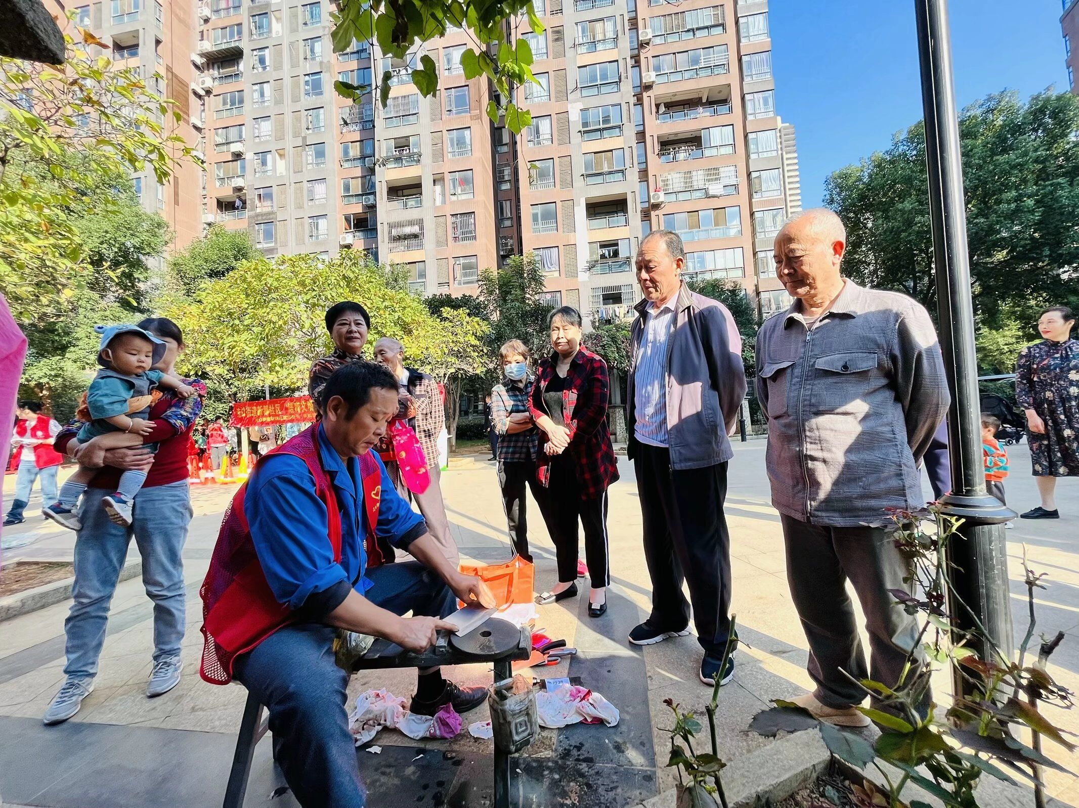一块磨刀石,一盆水,伴随着“吱,吱……”的响声,新都社区便民服务在君融天湖中心广场上正式拉开序幕,居民们拿着菜刀自觉地排起长队,理发师一边理发一边和居民拉着家常,缝纫的阿姨耐心地询问居民们的需求……