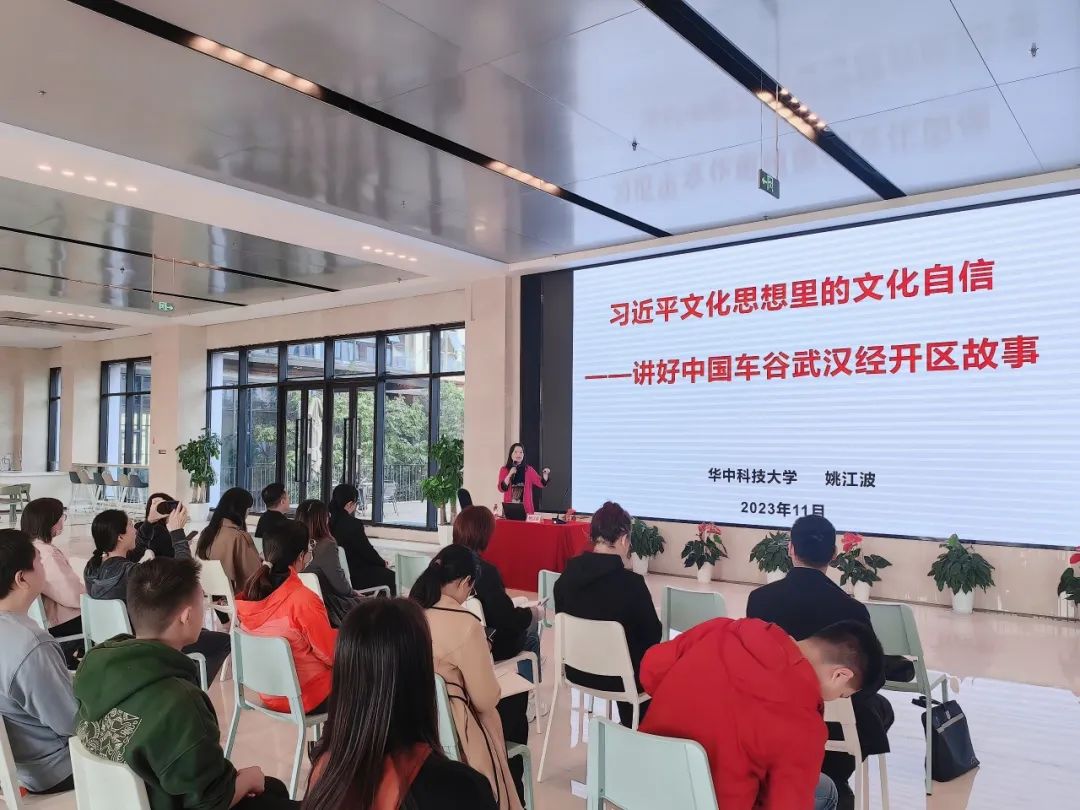 在南太子湖创新谷武汉经开科创服务有限公司,省宣讲团成员、华中科技大学马克思主义学院兼职教授姚江波以“习近平文化思想里的文化自信——讲好中国车谷武汉经开区故事”为题进行了宣讲。“对历史最好的继承就是创造新的历史,共同创造属于我们这个时代的新文化,建设中华民族现代文明。”