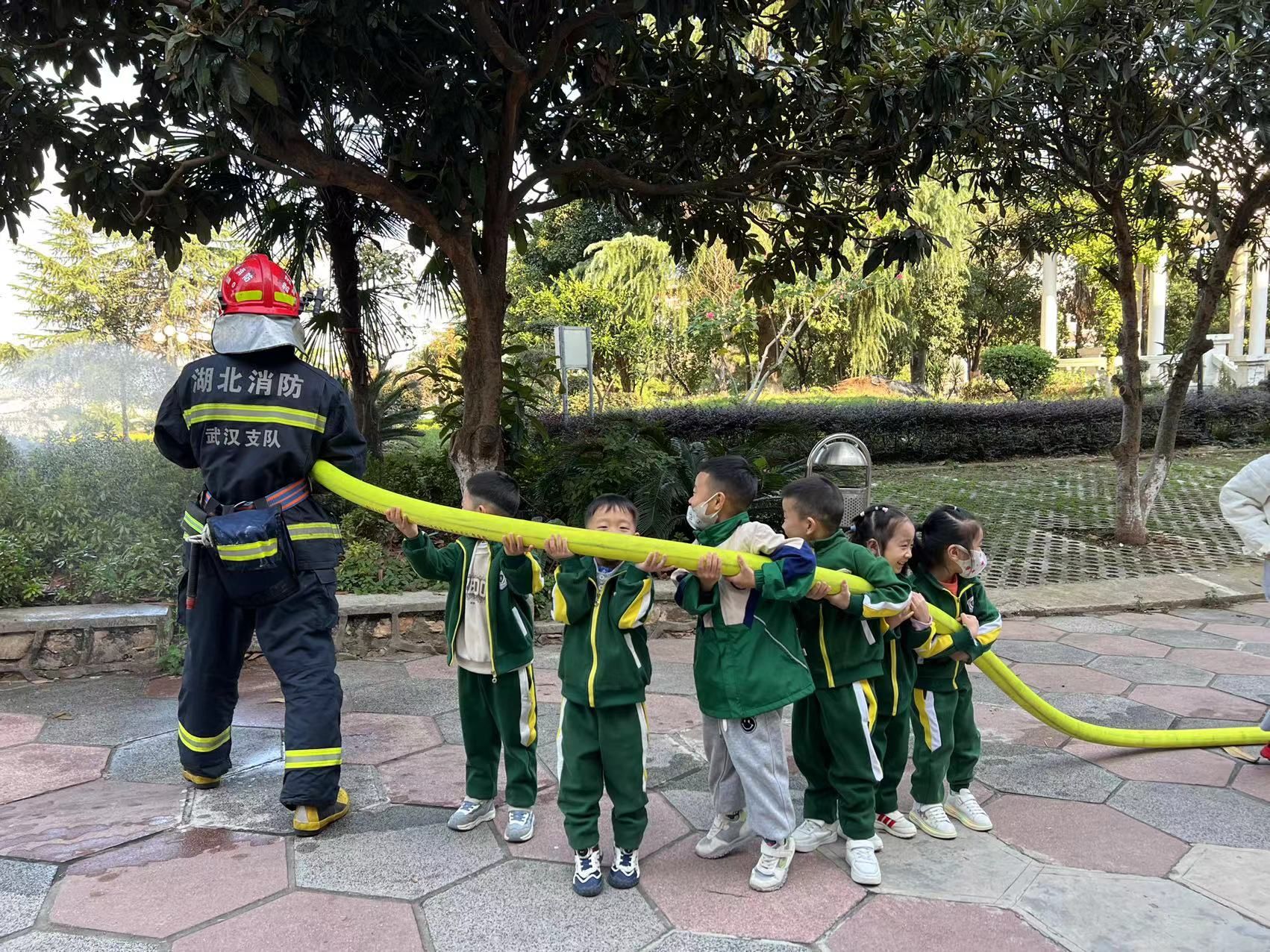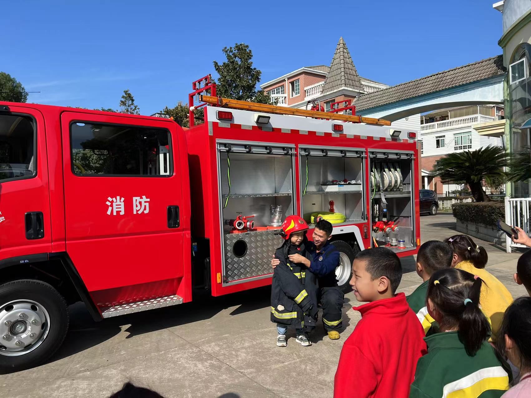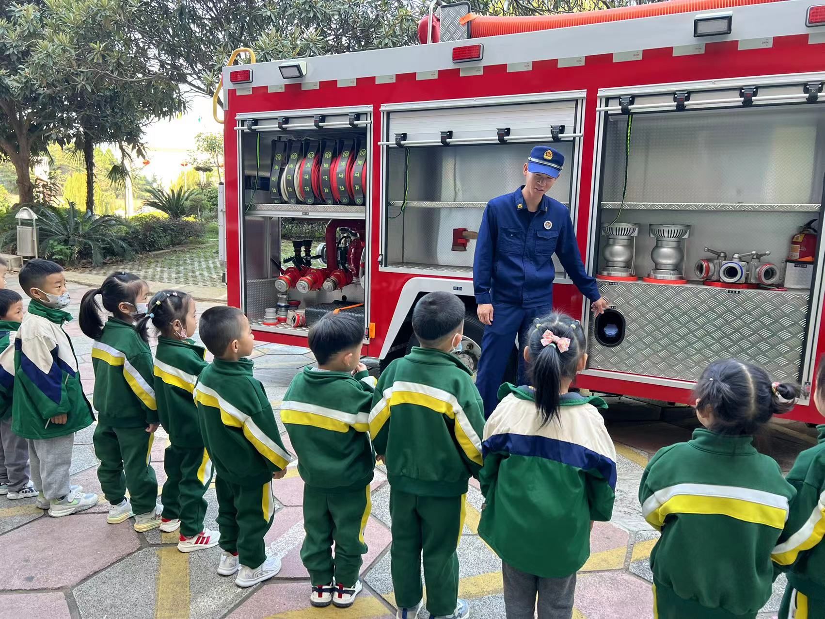 紧接着,消防员向小朋友介绍了高压水枪、消防水带、灭火器等消防器材,与小朋友们现场互动,当孩子们看着眼前高大、威武的“灭火战车”时,眼里充满了好奇,不时举手向消防员提问,消防员耐心地给予解答。