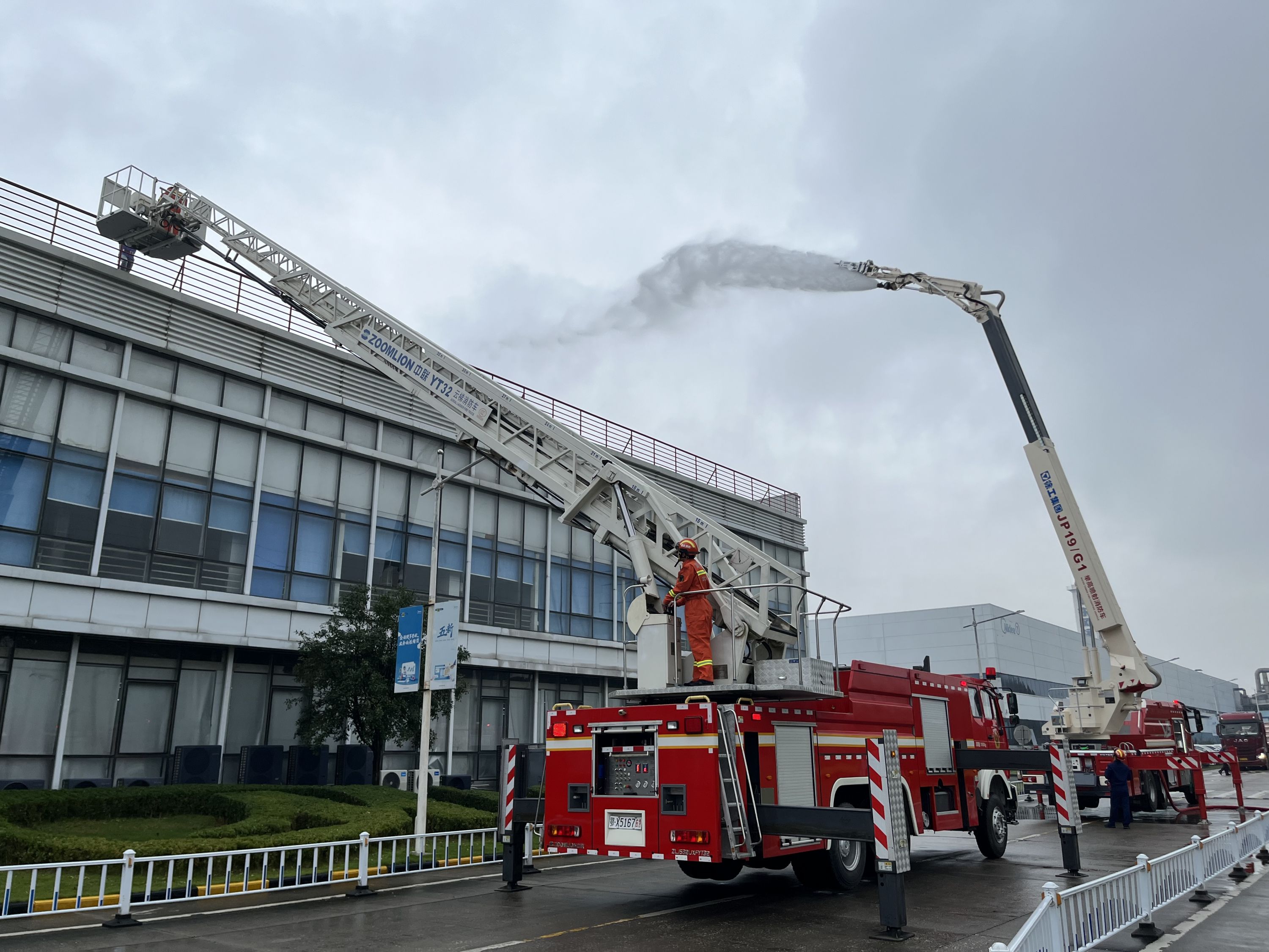 此次演练模拟了工厂中央办公楼发生火情。事发后,工厂立即启动消防应急预案,并拨打119报警。经开消防救援大队全力站接警后,迅速派出抢险救援车、泡沫水罐车、多功能城市主站车、云梯救援车、举高喷射消防车前往现场进行救援。
