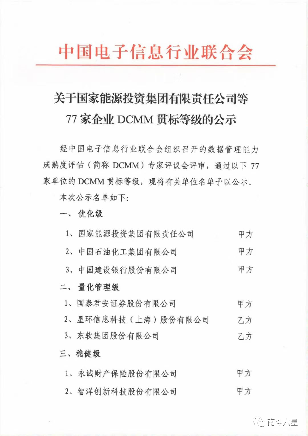 近日,中国电子信息行业联合会发布《关于国家能源投资集团有限责任公司等77家企业DCMM贯标等级的公示》,南斗六星系统集成有限公司(以下简称“南斗六星”)获得国家数据管理能力成熟度(DCMM)乙方三级(稳健级)证书,这是对南斗六星在数据管理和运营方面不懈努力的肯定,标志着南斗六星在数据战略和执行方面取得了里程碑式的突破。