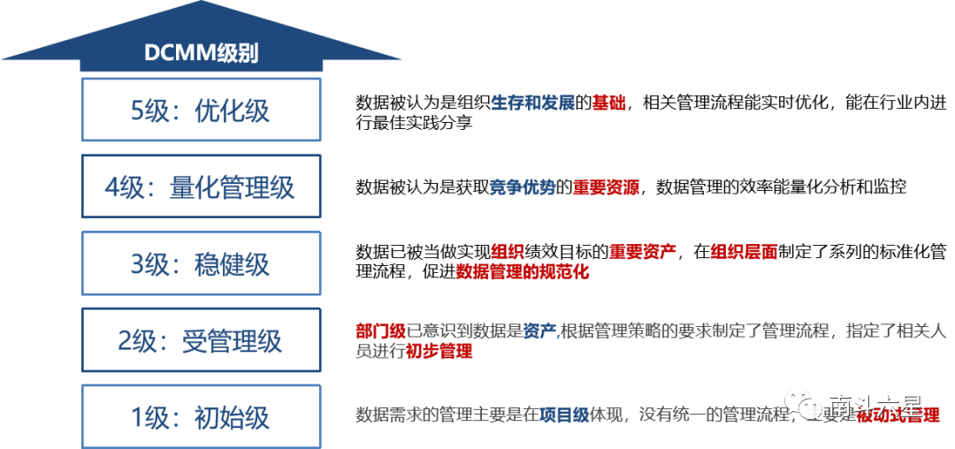 DCMM将数据管理能力成熟度划分为五个等级,自低向高依次为初始级(1级)、受管理级(2级)、稳健级(3级)、量化管理级(4级)和优化级(5级),不同等级代表企业数据管理和应用的成熟度水平不同。