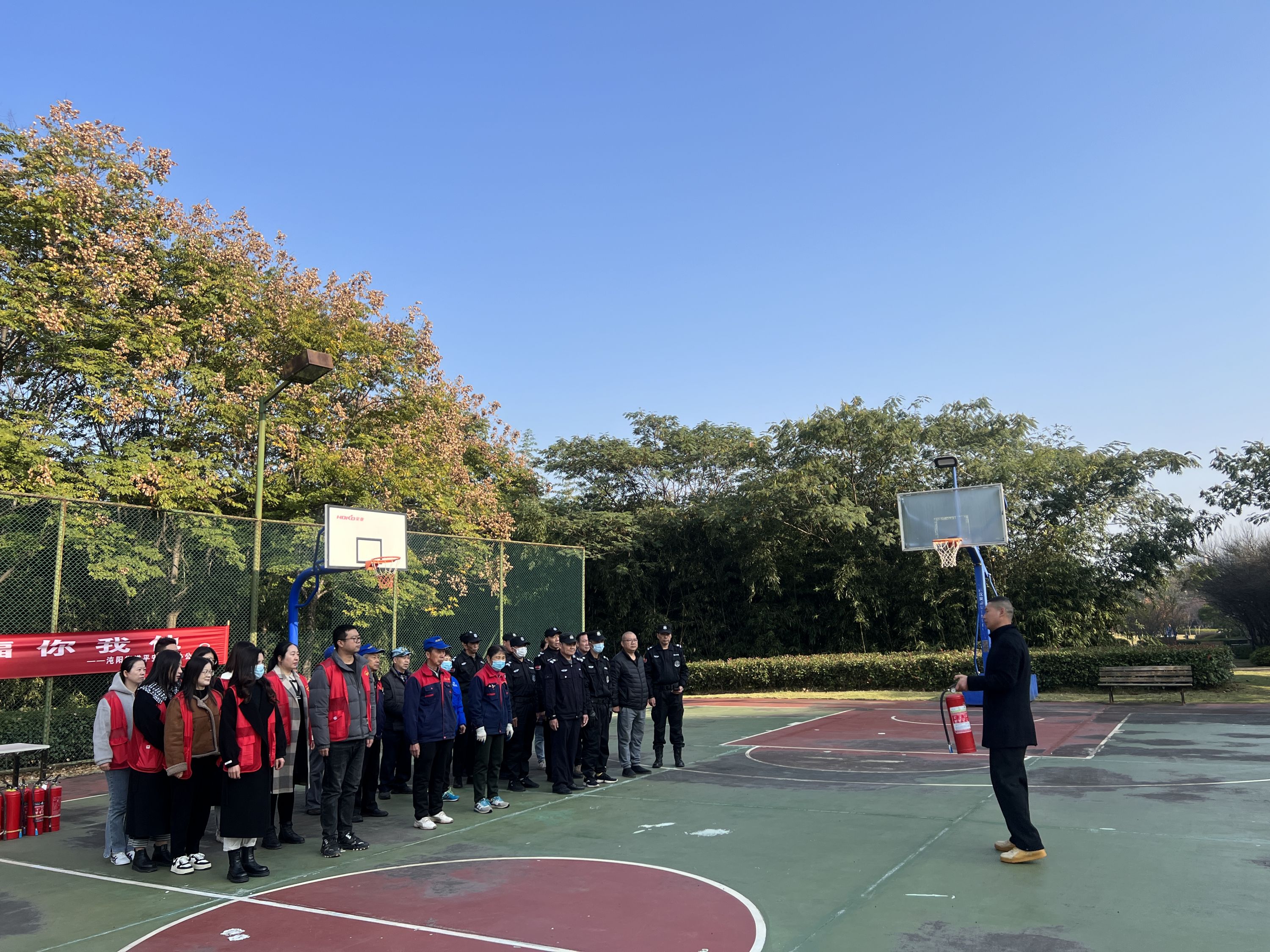 活动现场,消防应急站工作人员向演习参与人员介绍了消防安全的重要性和本次演习的目的,强调火灾预防和应急救援的重要性,并详细介绍不同类型灭火器材的使用方法和注意事项。参与演习的队伍各派出一个代表,现场实操并打分。