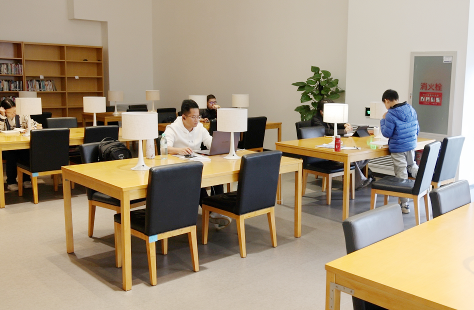 馆内布置简约明快,只见三三两两的读者手捧着喜爱的书,静坐在落地窗旁,园景、湖色尽收眼底,累了抬眼看看窗外的湖光风景。偶尔有一两只白鹭轻盈地掠过湖面,给宁静的景色增添了一点诗意,十分惬意。