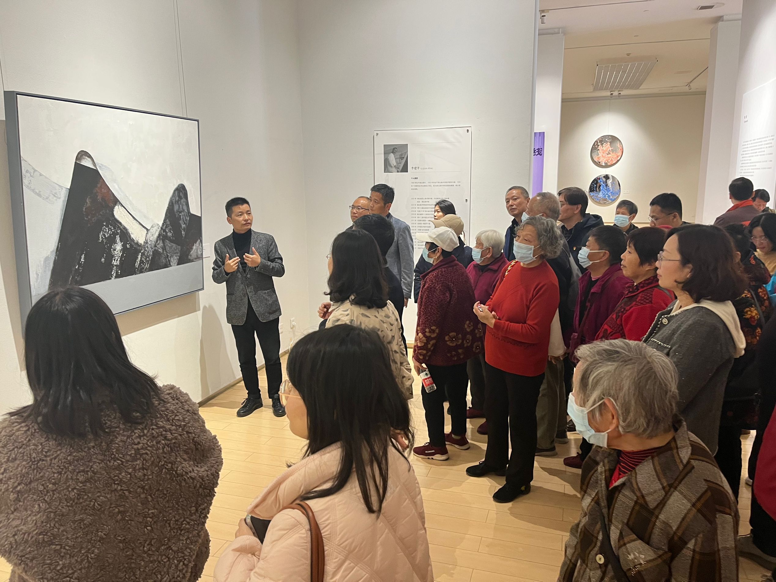 江汉大学美术学院专业讲解员细心讲解美术作品,大家听得津津有味。跟随着讲解员的步伐看着一幅幅精美的山水画展,老人们放松身心慢慢地欣赏每一幅作品,感受艺术的魅力,交流分享自己的看法,感受文化的魅力。