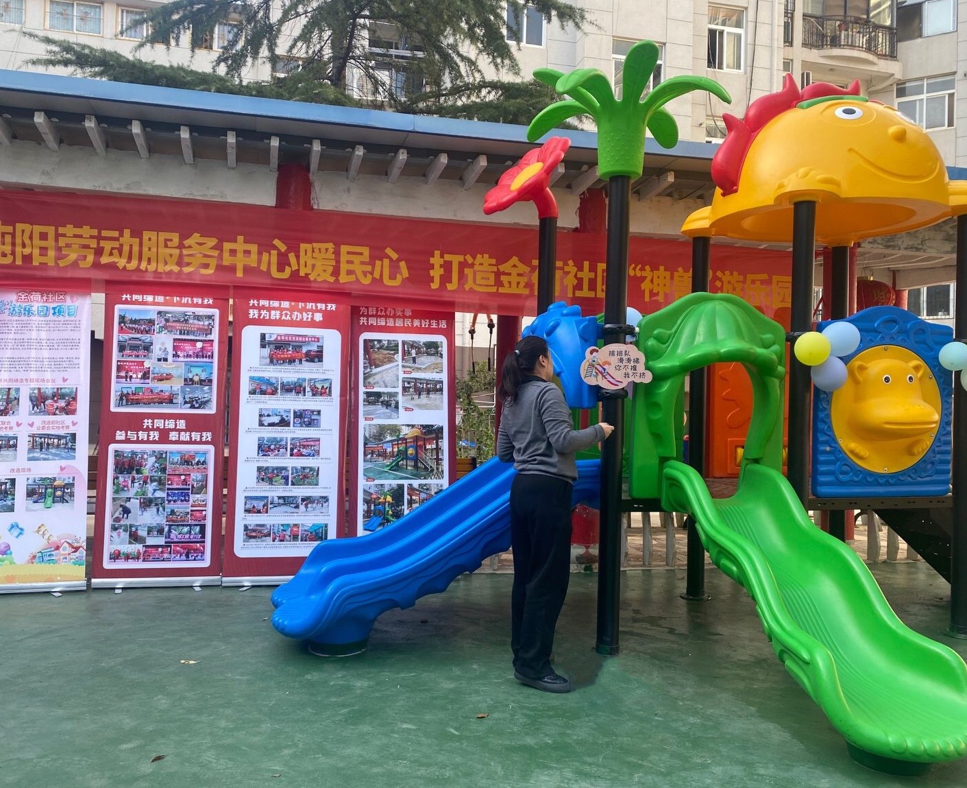 车谷融媒11月30日讯 近日,沌阳街道金荷社区针对居民群众对于小区增添儿童游乐设施的需求,经过与共建单位沌阳劳动服务中心进行多次积极协商和走访,最终儿童游乐园在阳光丽景小区“平地而起”,获得群众的一致好评。