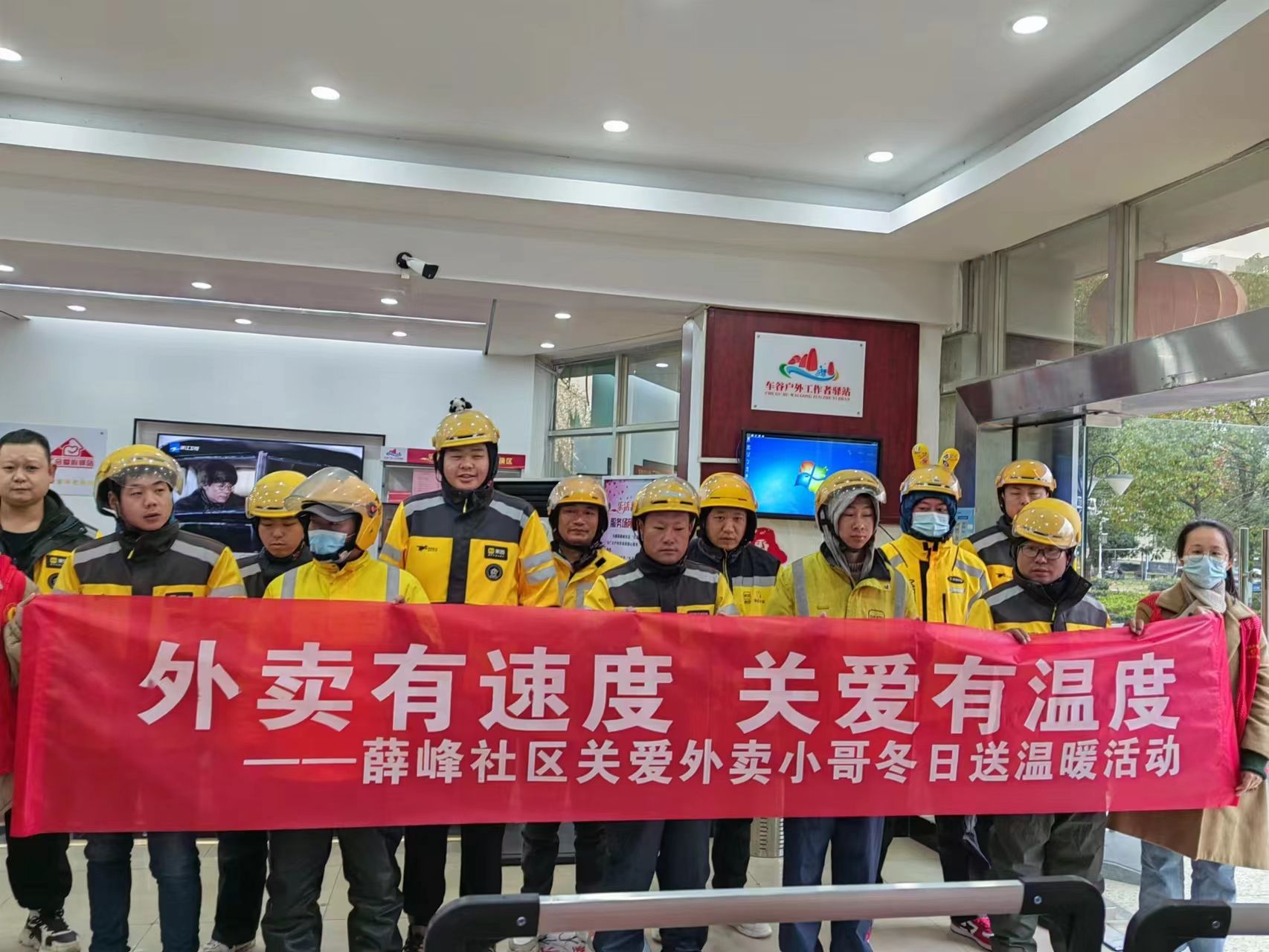 车谷融媒12月1日讯 11月30日,沌阳街道薛峰社区在户外工作者驿站开展关爱外卖小哥冬日送温暖活动。