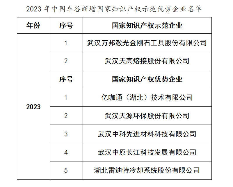 车谷融媒12月4日讯 日前,国家知识产权局公布2023年度国家知识产权示范企业和优势企业评定结果,武汉经开区武汉万邦激光金刚石工具股份有限公司、武汉天高熔接股份有限公司等2家企业获评国家知识产权示范企业,亿咖通(湖北)技术有限公司、武汉天源环保股份有限公司、武汉中科先进材料科技有限公司、武汉中原长江科技发展有限公司、湖北雷迪特冷却系统股份有限公司等5家企业获评国家知识产权优势企业。