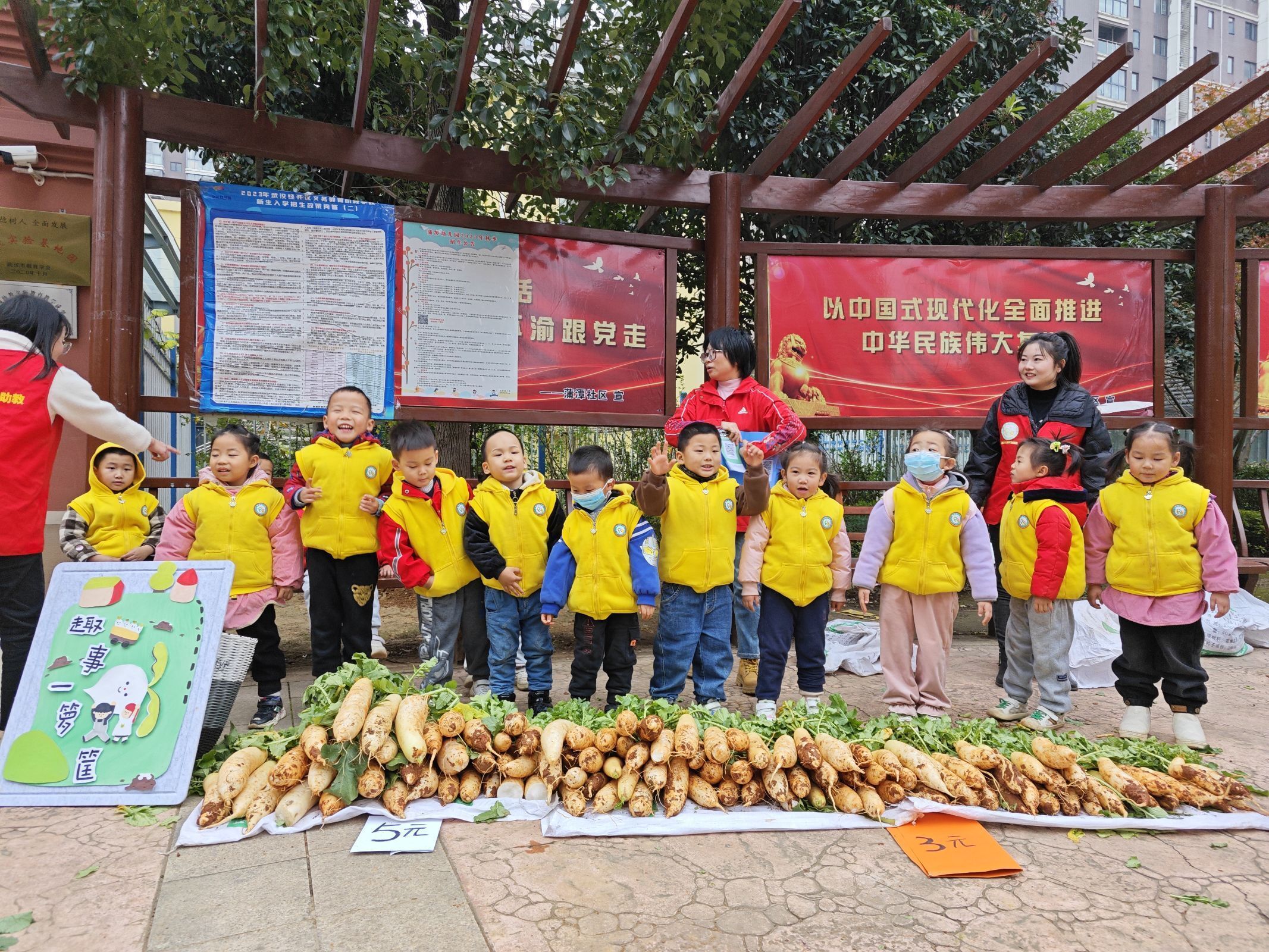 师生们齐心协力将采摘的萝卜运到幼儿园门口的萝卜摊位。孩子们按捺不住地大声推销着自己的萝卜。“大萝卜4元一个,中号萝卜2元一个,小萝卜1元一个……”叫卖声此起彼伏,幼儿园门口瞬间成了学生们的“角色游戏区”。