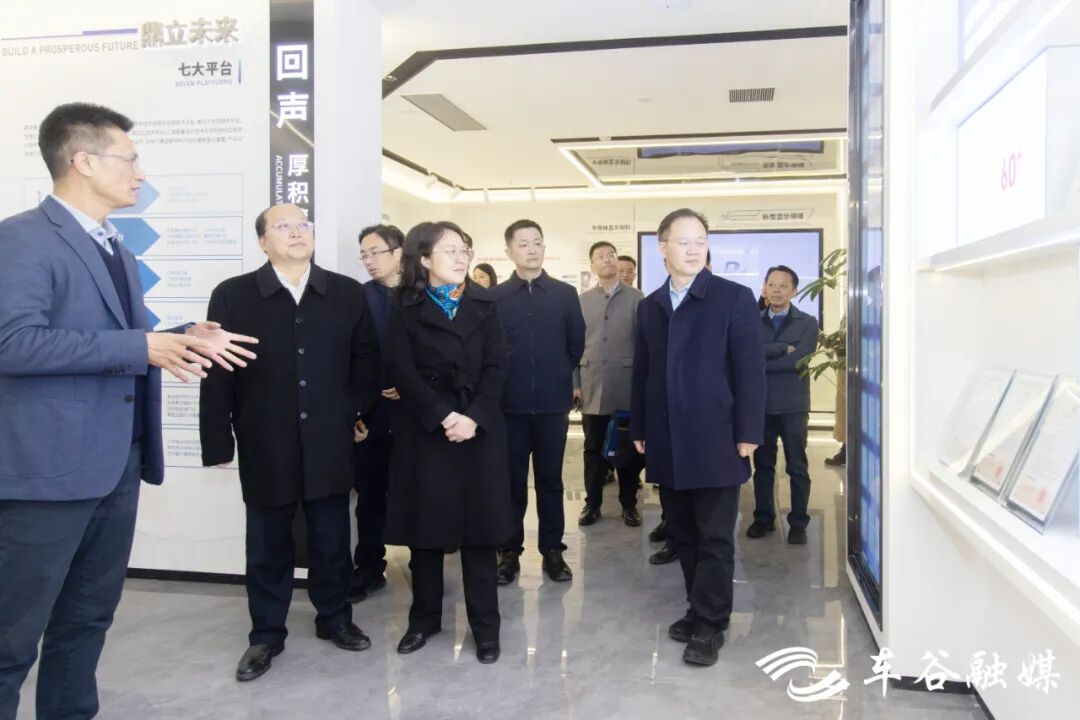 在鼎龙控股,董丹红一行详细了解企业生产经营、技术创新和市场应用情况,现场察看企业在集成电路、新型显示和打印复印通用耗材等领域的主要产品及研发成果。