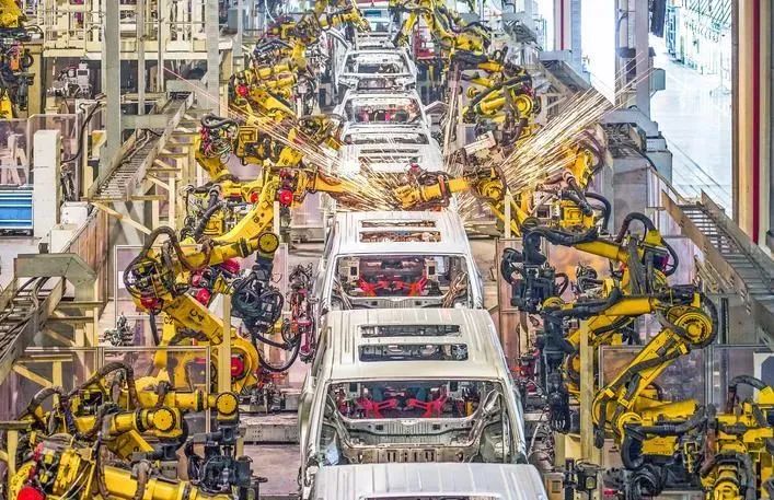 ▲冲焊车间内焊花四射,机器人焊接新能源汽车。