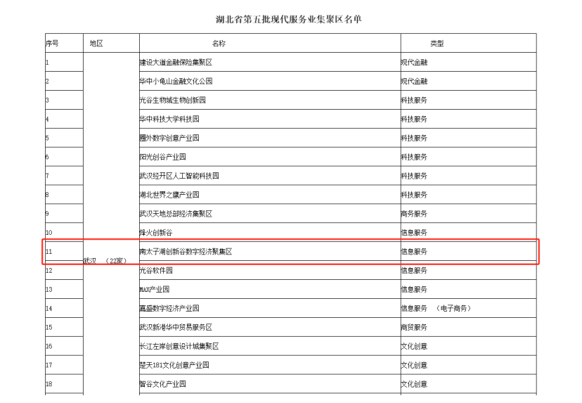 车谷融媒12月21日讯 12月15日,湖北省发展和改革委员会官网公布《关于湖北省第五批现代服务业集聚区认定结果的公示》,南太子湖创新谷数字经济聚集区成功入选湖北省第五批现代服务业集聚区。