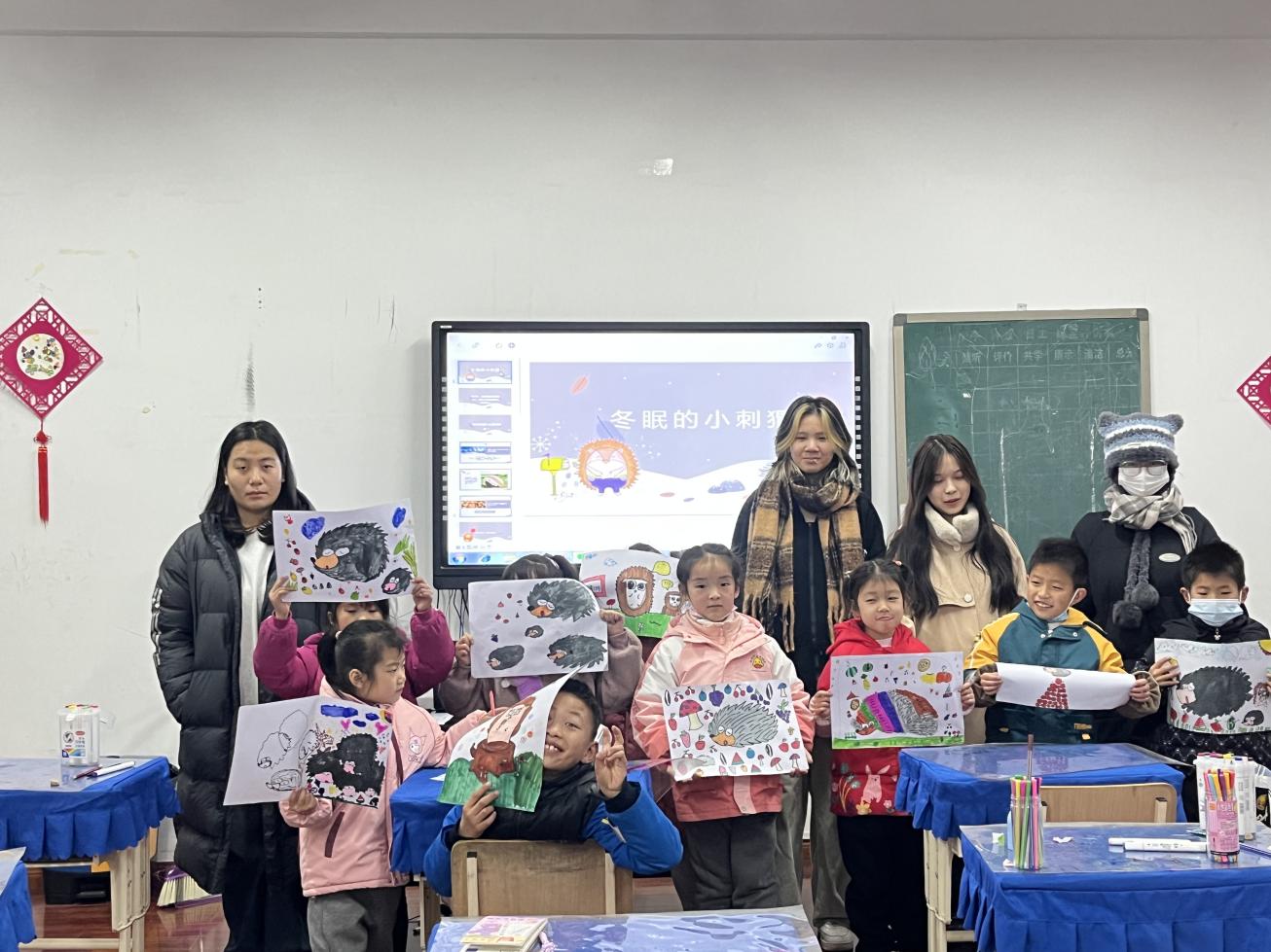 在绘画课上,来自江汉大学设计学院的志愿者老师们巧借冬天的第一场雪,带领孩子们描绘了冬眠的小刺猬,勾勒、配色、绘图……慵懒的小刺猬形象逐渐浮现在纸面上,孩子们欢欢喜喜的分享各自的“劳动成果”。书法课上,来自三角湖小学的志愿者教师从一点一横开始,细心地指导孩子们握笔、下笔,从歪歪扭扭到字迹工整,孩子们共同见证着彼此的进步。书法绘画课后,还有三角湖小学的音乐老师带大家一起学习演唱红歌《十送红军》,讲述歌曲背后的抗战故事。