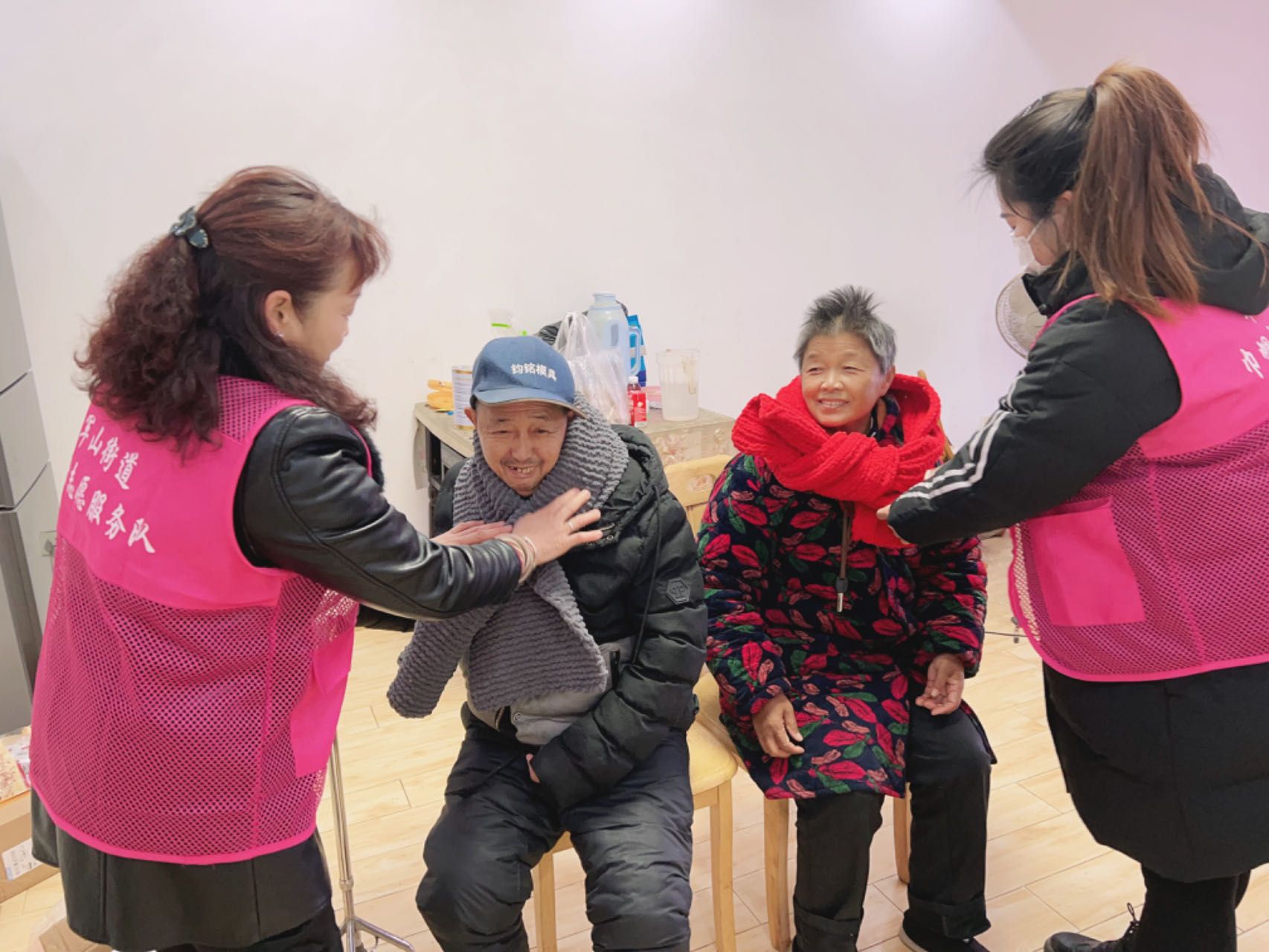 12月20日一大早,志愿者们就上门给老人和小孩送围巾。今年60岁的周社珍老人家庭生活困难,平时生活不便。当志愿者为老人戴上围巾时,老人格外开心:“你们给我送来了围巾,真的是太感谢你们了啊!”离开的时候,志愿者还不忘提醒他们天气寒冷要注意适量增加衣物,有什么需要都可以联系社区。