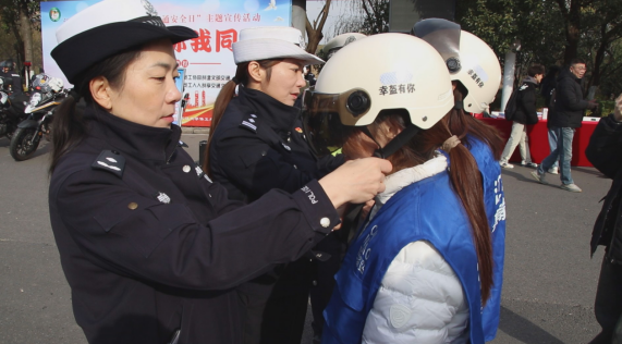 武汉市公安局交通管理局宣传处、武汉经开区交通大队、江汉大学负责人现场向师生们赠送电动自行车安全头盔,现场演示安全头盔的正确佩戴方法,提醒师生们驾驶电动自行车时要佩戴安全头盔,不要与大型货车争道抢行等交通法规。