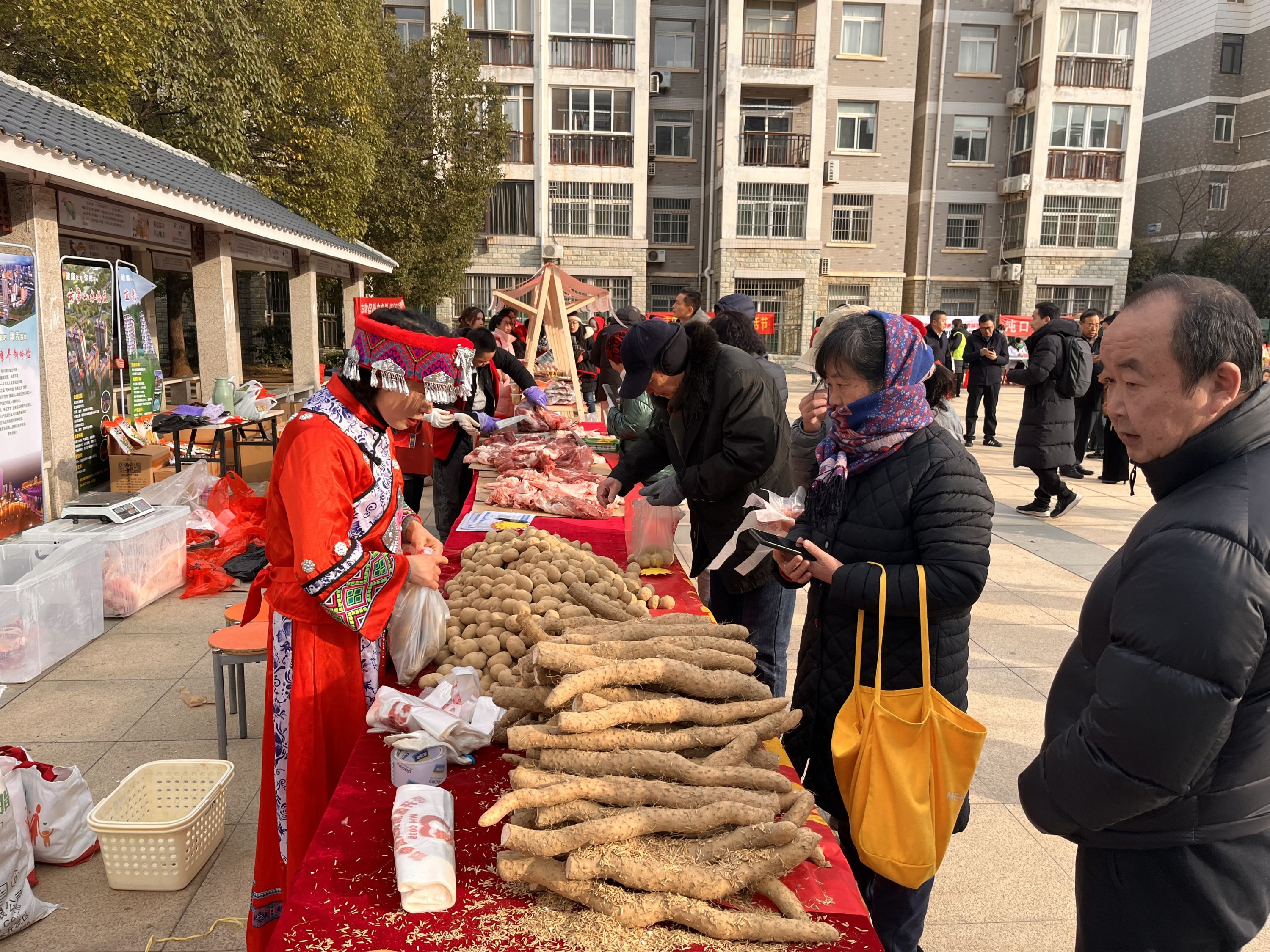 活动现场,山药、土豆、猪肉、大米等琳琅满目的利川农特产品,吸引许多市民前来参观、购买。