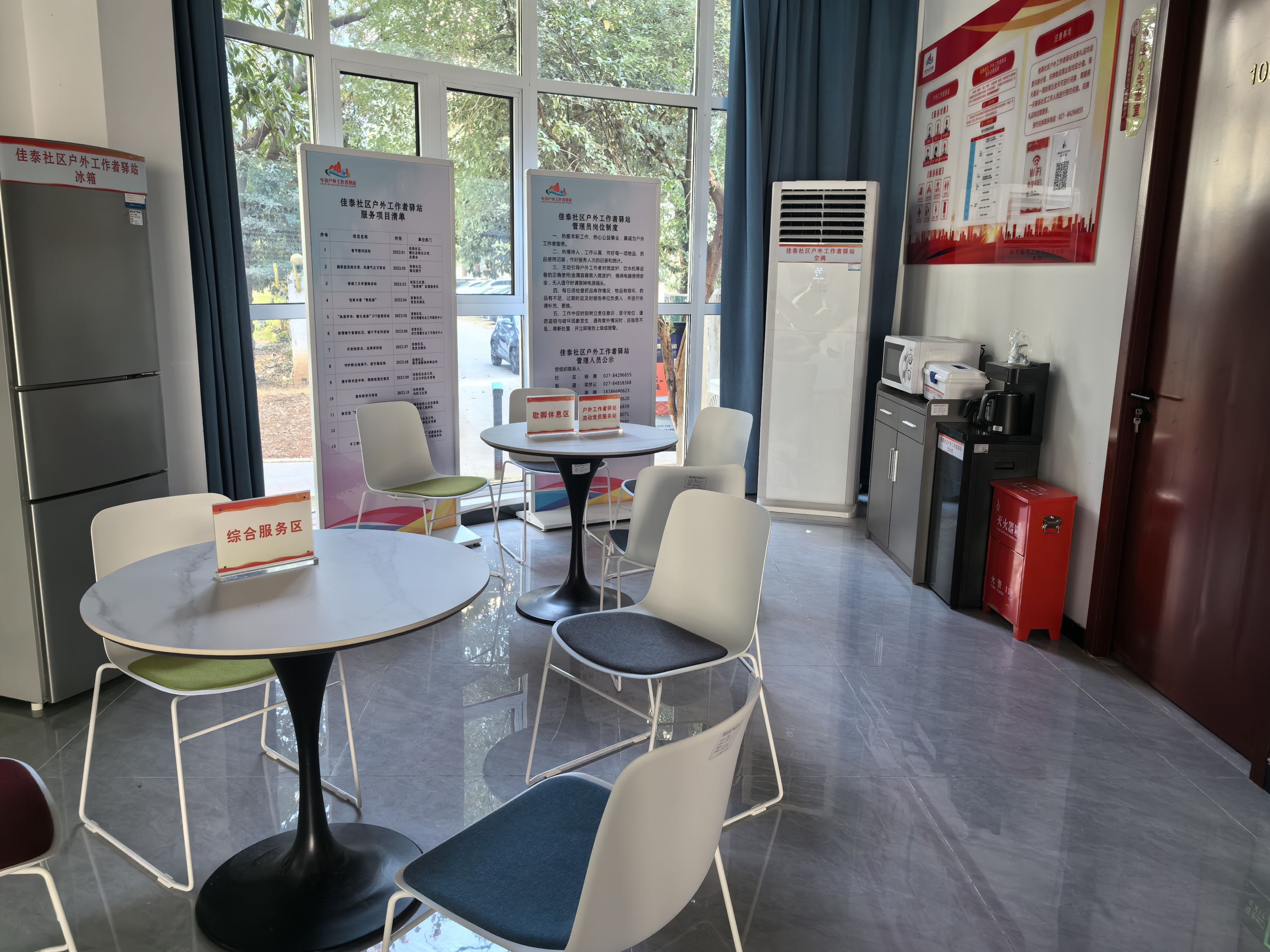 驿站面积虽然不大,但环境干净整洁、设施设备一应俱全。内设无线网络、桌凳、微波炉、饮水机、手机充电设备、应急药箱、报刊书籍柜、雨伞、空调等,为户外劳动者提供休憩、饭茶加热、取暖纳凉、手机充电、临时避雨等基本保障服务。