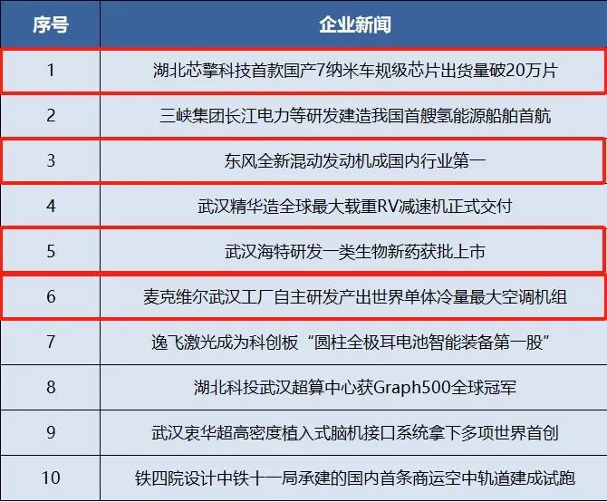 “湖北芯擎科技首款国产7纳米车规级芯片出货量破20万片”、“东风全新混动发动机成国内行业第一”、“武汉海特研发一类生物新药获批上市”、“麦克维尔武汉工厂自主研发产出世界单体冷量最大空调机组”4项武汉经开区新闻入选。