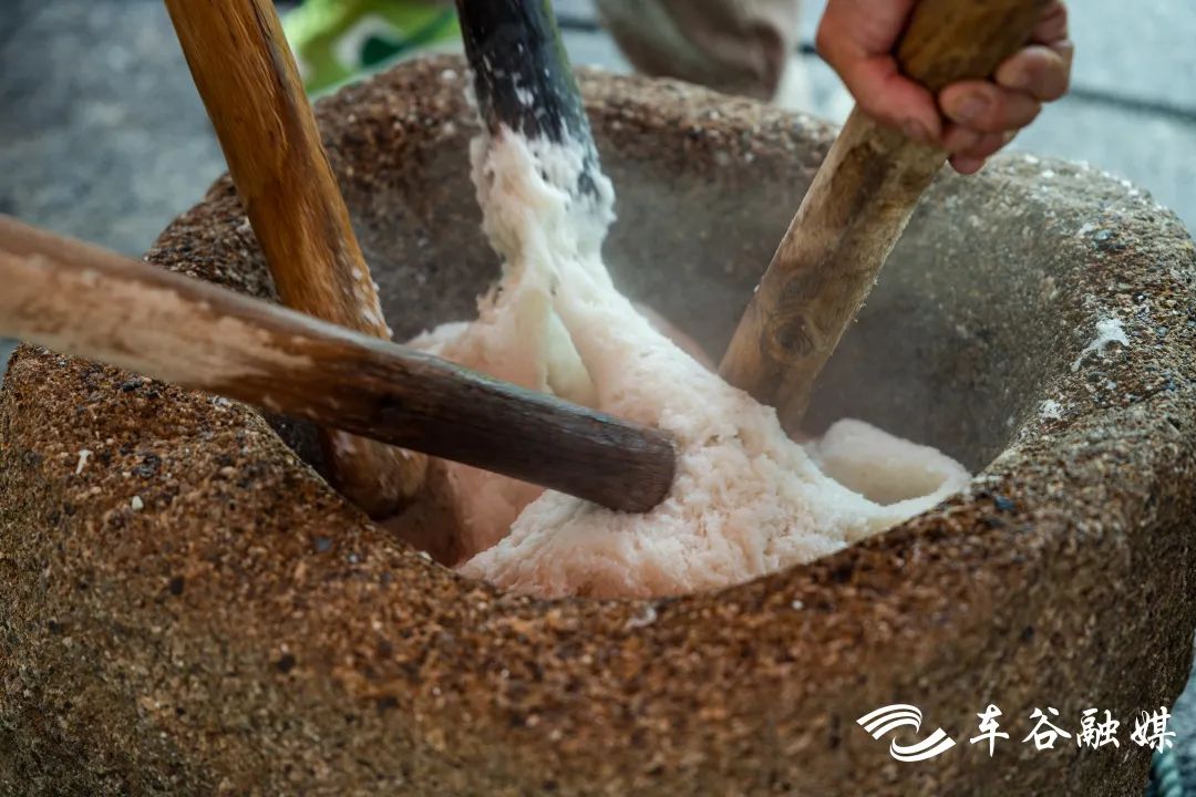 “大家愿不愿意进来搭把手?”12点半,糯米要与蒸笼说“再见”了,只见摊主和工作人员齐心协力,将蒸好的糯米倒入石瓮,拿起已经准备好的木桩,热情地向市民打招呼。6岁的王嘉诚自告奋勇,接过木桩,与摊主等四人围成一团,用木桩交叉式地敲打着石瓮中白气腾腾的糯米,一边打一边逆时针转动,几分钟后,粒粒分明的糯米就粘成一团……
